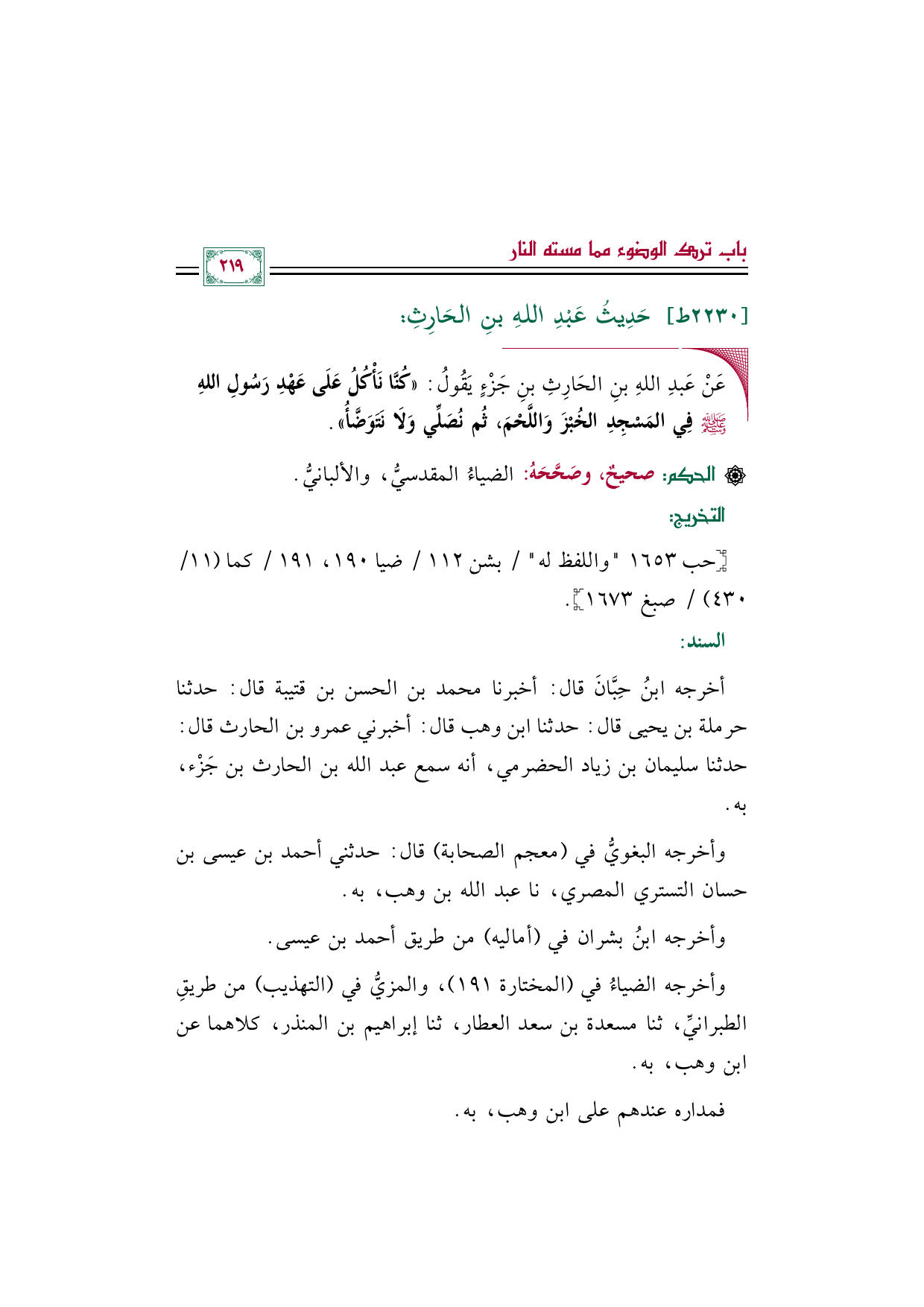 أخرجه ابنُ حِبَّانَ قال: أخبرنا محمد بن الحسن بن قتيبة قال: حدثنا حرملة بن يحيى قال: حدثنا ابن وهب قال: أخبرني عمرو بن الحارث قال: حدثنا سليمان بن زياد الحضرمي، أنه سمع عبد الله بن الحارث بن جَزْء، به.