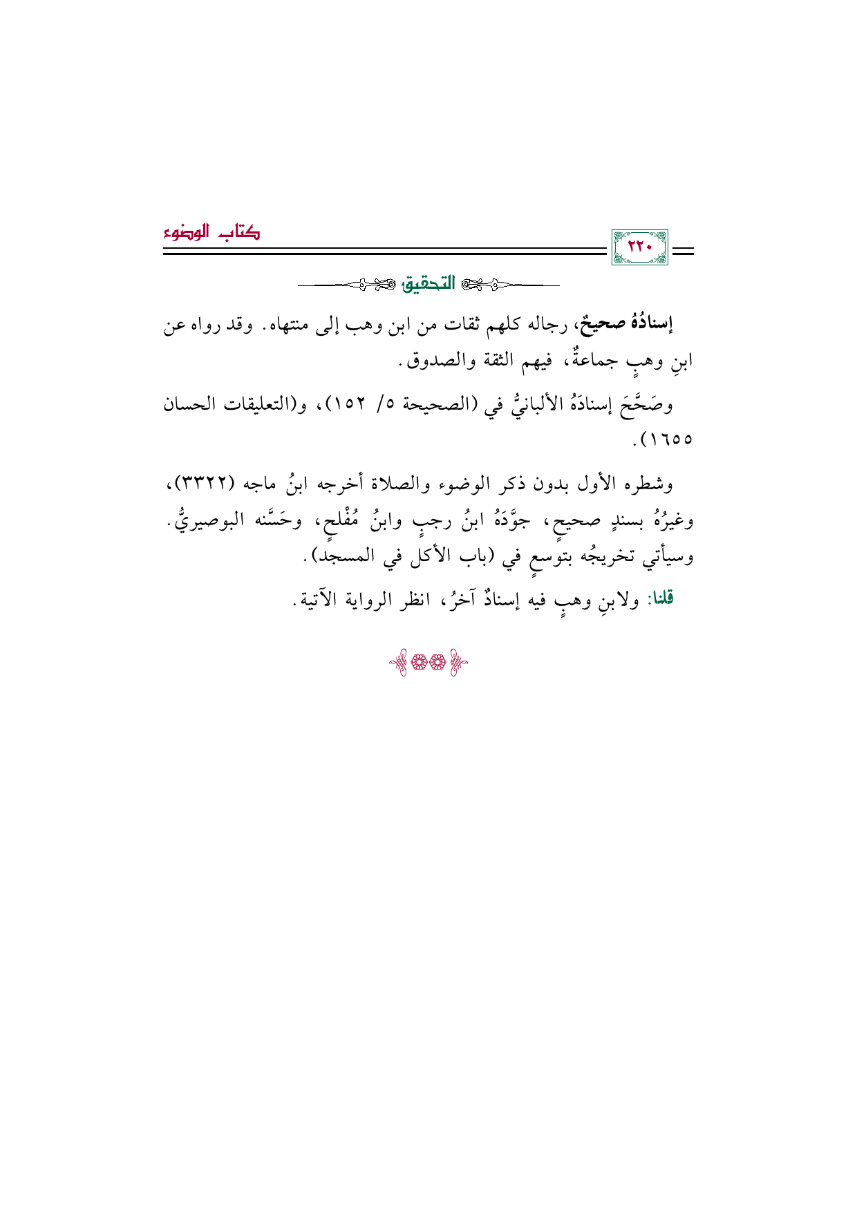 وشطره الأول بدون ذكر الوضوء والصلاة أخرجه ابنُ ماجه (٣٣٢٢)، وغيرُهُ بسندٍ صحيحٍ، جوَّدَهُ ابنُ رجبٍ وابنُ مُفْلحٍ، وحَسَّنه البوصيريُّ. وسيأتي تخريجُه بتوسعٍ في (باب الأكل في المسجد).