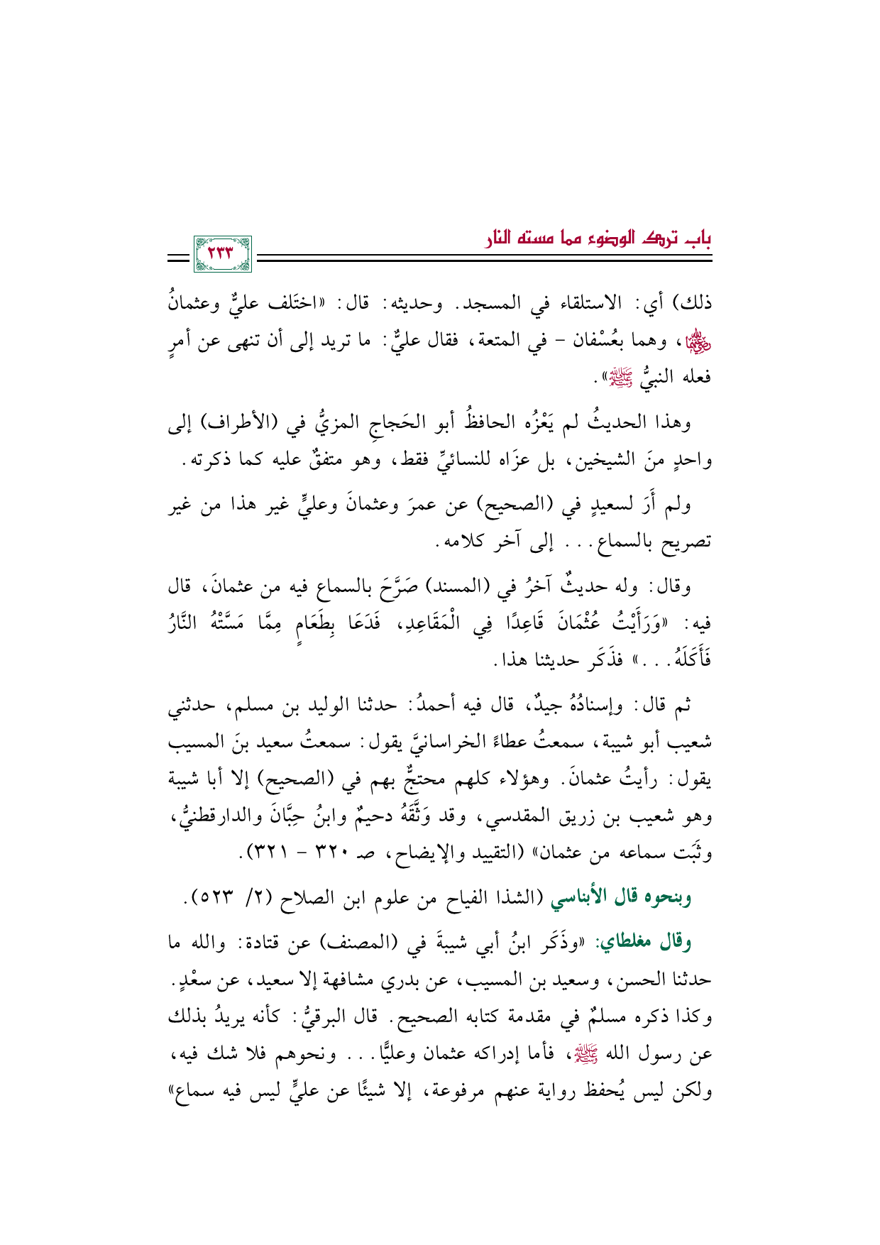 ذلك) أي: الاستلقاء في المسجد. وحديثه: قال: ((اختَلف عليٌّ وعثمانُ رضي الله عنهما، وهما بعُسْفان- في المتعة، فقال عليٌّ: ما تريد إلى أن تنهى عن أمرٍ فعله النبيُّ صلى الله عليه وسلم)).