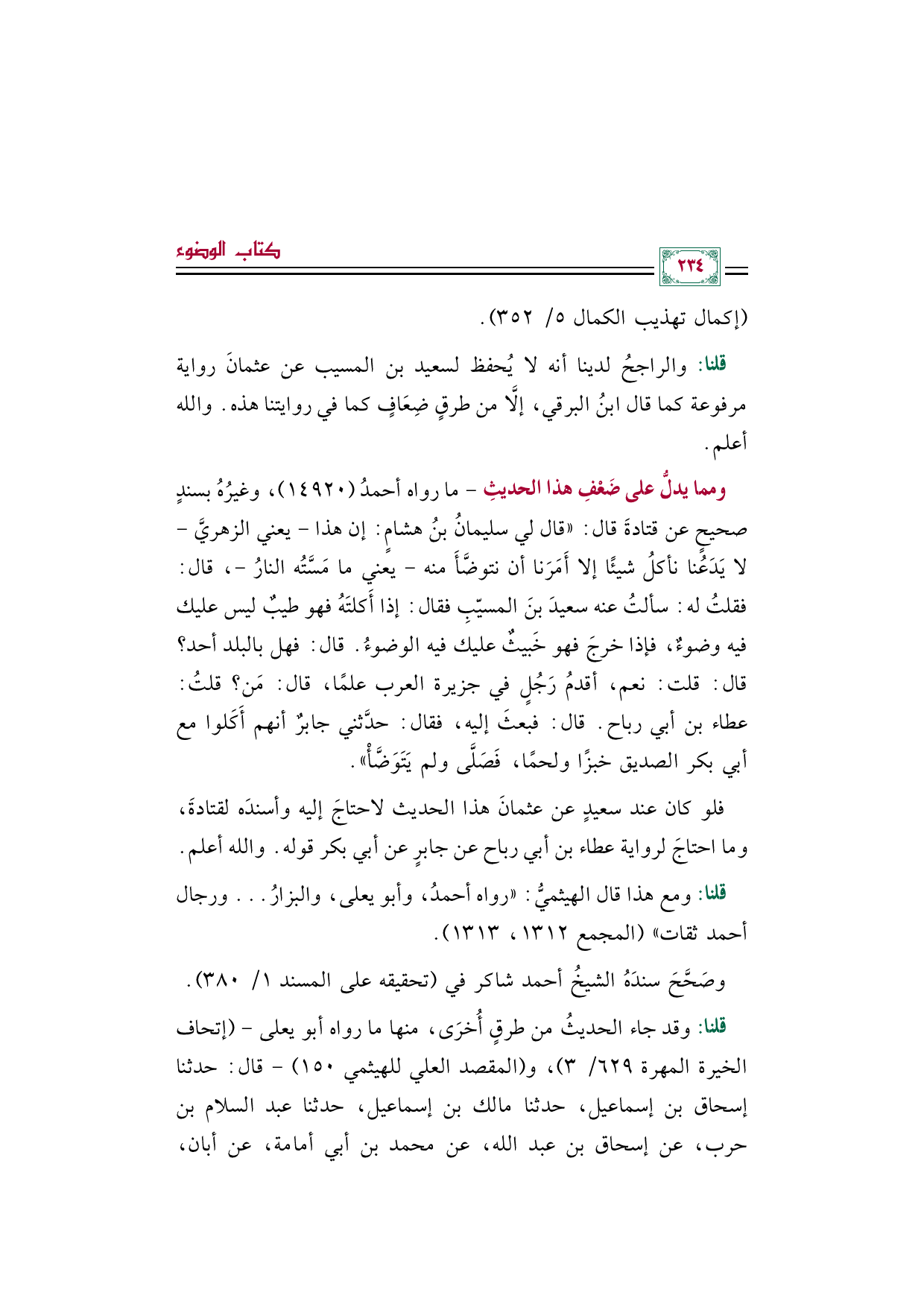 ومما يدلُّ على ضَعْفِ هذا الحديثِ- ما رواه أحمدُ (١٤٩٢٠)، وغيرُهُ بسندٍ صحيحٍ عن قتادةَ قال: ((قال لي سليمانُ بنُ هشامٍ: إن هذا -يعني الزهريَّ- لا يَدَعُنا نأكلُ شيئًا إلا أَمَرَنا أن نتوضَّأَ منه -يعني ما مَسَّتُه النارُ-، قال: فقلتُ له: سألتُ عنه سعيدَ بنَ المسيّبِ فقال: إذا أَكلتَهُ فهو طيبٌ ليس عليك فيه وضوءٌ، فإذا خرجَ فهو خَبيثٌ عليك فيه الوضوءُ. قال: فهل بالبلد أحد؟ قال: قلت: نعم، أقدمُ رَجُلٍ في جزيرة العرب علمًا، قال: مَن؟ قلتُ: عطاء بن أبي رباح. قال: فبعثَ إليه، فقال: حدَّثني جابرٌ أنهم أَكَلوا مع أبي بكر الصديق خبزًا ولحمًا، فَصَلَّى ولم يَتَوَضَّأْ)).