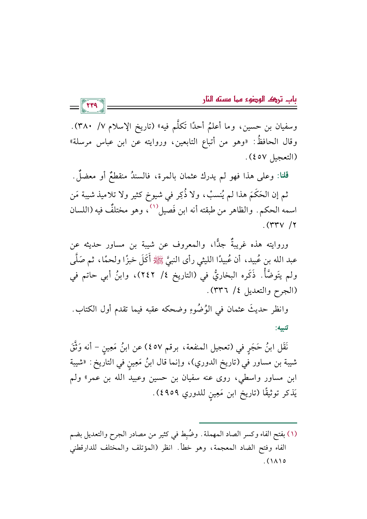 وروايته هذه غريبةٌ جدًّا، والمعروف عن شيبة بن مساور حديثه عن عبد الله بن عُبيد، أن عُبيدًا الليثي رأى النبيَّ صلى الله عليه وسلم أَكَلَ خبزًا ولحمًا، ثم صَلَّى ولم يتَوضَّأْ. ذَكَره البخاريُّ في (التاريخ ٤/ ٢٤٢)، وابنُ أبي حاتم في (الجرح والتعديل ٤/ ٣٣٦).