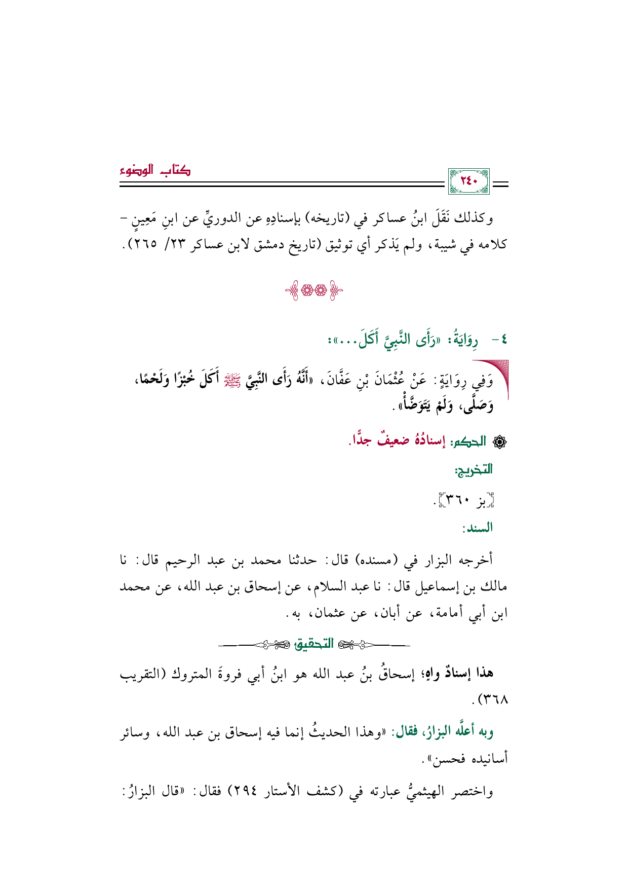 أخرجه (البزار في مسنده) قال: حدثنا محمد بن عبد الرحيم قال: نا مالك بن إسماعيل قال: نا عبد السلام، عن إسحاق بن عبد الله، عن محمد بن أبي أمامة، عن أبان، عن عثمان، به.
