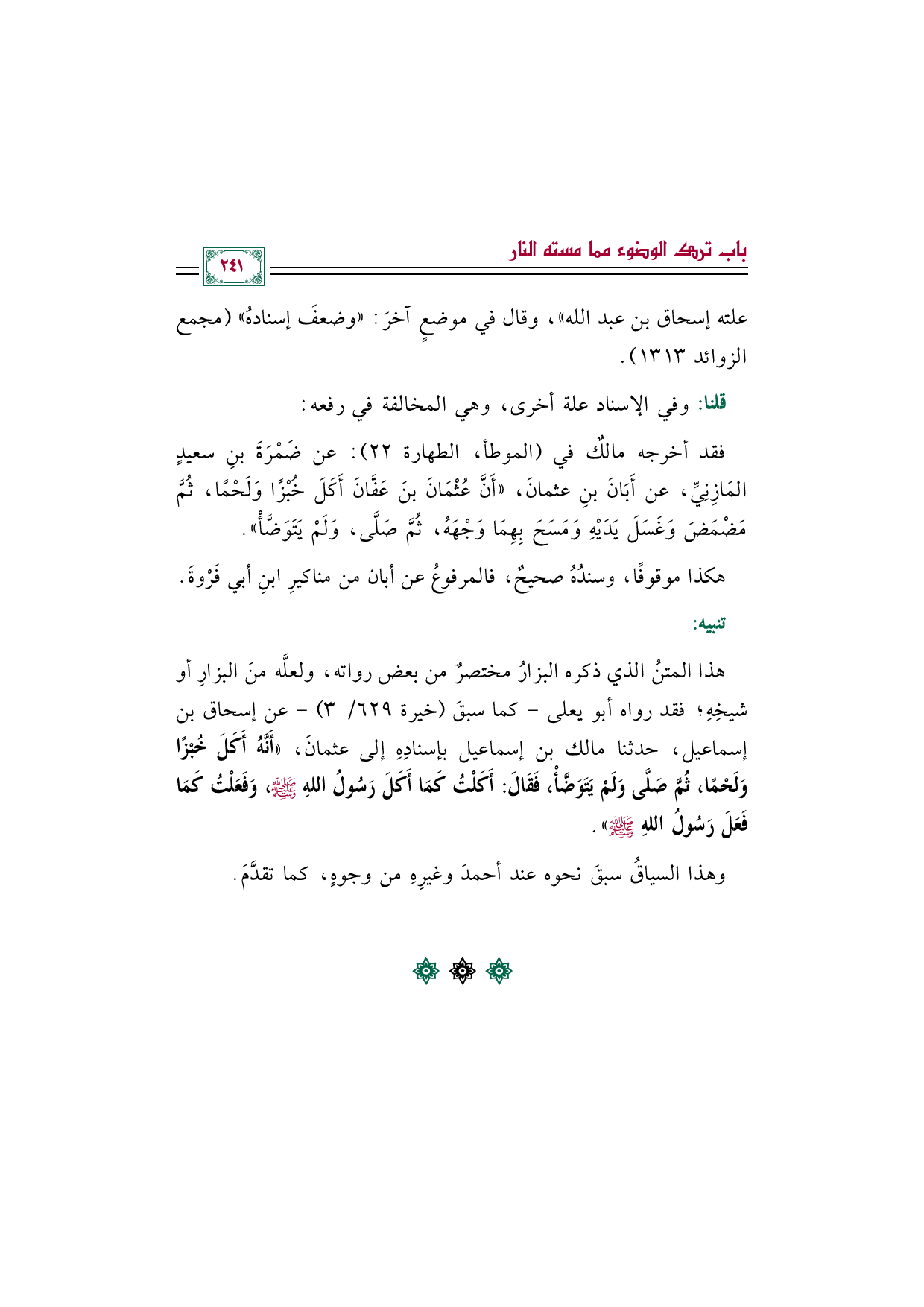 هذا المتنُ الذي ذكره البزارُ مختصرٌ من بعض رواته، ولعلَّه منَ البزارِ أو شيخِهِ؛ فقد رواه أبو يعلى -كما سبقَ (خيرة ٦٢٩/ ٣) - عن إسحاق بن إسماعيل، حدثنا مالك بن إسماعيل بإسنادِهِ إلى عثمانَ، ((أَنَّهُ أَكَلَ خُبْزًا وَلَحْمًا، ثُمَّ صَلَّى وَلَمْ يَتَوَضَّأْ، فَقَالَ: أَكَلْتُ كَمَا أَكَلَ رَسُولُ اللهِ صلى الله عليه وسلم، وَفَعَلْتُ كَمَا فَعَلَ رَسُولُ اللهِ صلى الله عليه وسلم)).