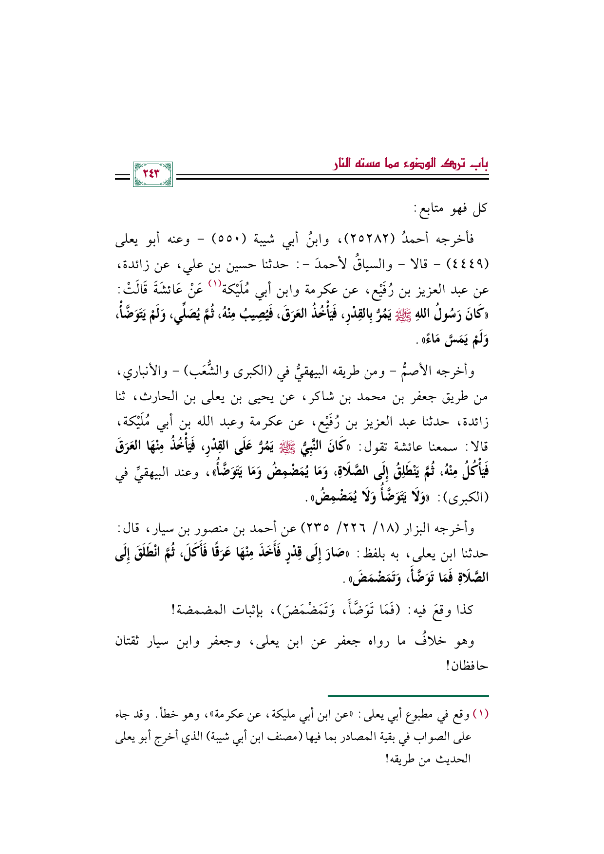 وأخرجه الأصمُّ -ومن طريقه البيهقيُّ في (الكبرى والشُّعَب) - والأنباري، من طريق جعفر بن محمد بن شاكر، عن يحيى بن يعلى بن الحارث، ثنا زائدة، حدثنا عبد العزيز بن رُفَيْع، عن عكرمة وعبد الله بن أبي مُلَيْكة، قالا: سمعنا عائشة تقول: ((كَانَ النَّبِيُّ صلى الله عليه وسلم يَمُرُّ عَلَى القِدْرِ، فَيَأْخُذُ مِنْهَا العَرَقَ فَيَأْكُلُ مِنْهُ، ثُمَّ يَنْطَلِقُ إِلَى الصَّلَاةِ، وَمَا يُمَضْمِضُ وَمَا يَتَوَضَّأُ))، وعند البيهقيِّ في (الكبرى): ((وَلَا يَتَوَضَّأُ وَلَا يُمَضْمِضُ)).