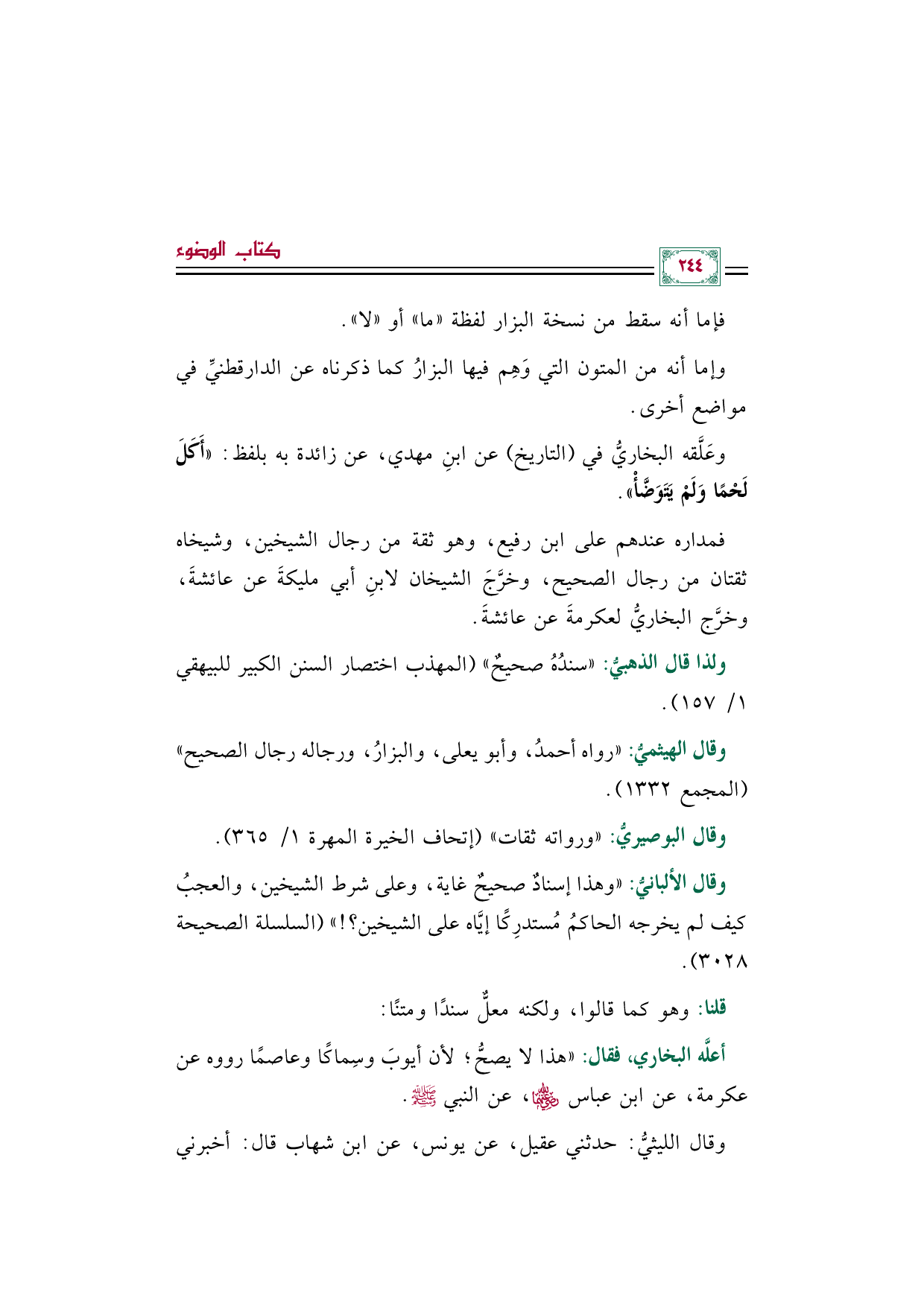 وعَلَّقه البخاريُّ في (التاريخ) عن ابنِ مهدي، عن زائدة به بلفظ: ((أَكَلَ لَحْمًا وَلَمْ يَتَوَضَّأْ)).