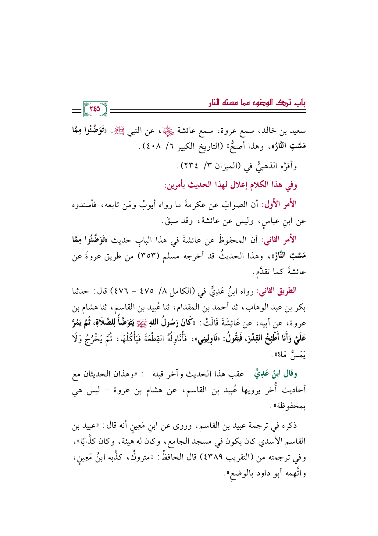 سعيد بن خالد، سمع عروة، سمع عائشة رضي الله عنها، عن النبي صلى الله عليه وسلم: ((تَوَضَّئُوا مِمَّا مَسَّتِ النَّارُ))، وهذا أصحُّ" (التاريخ الكبير ٦/ ٤٠٨).