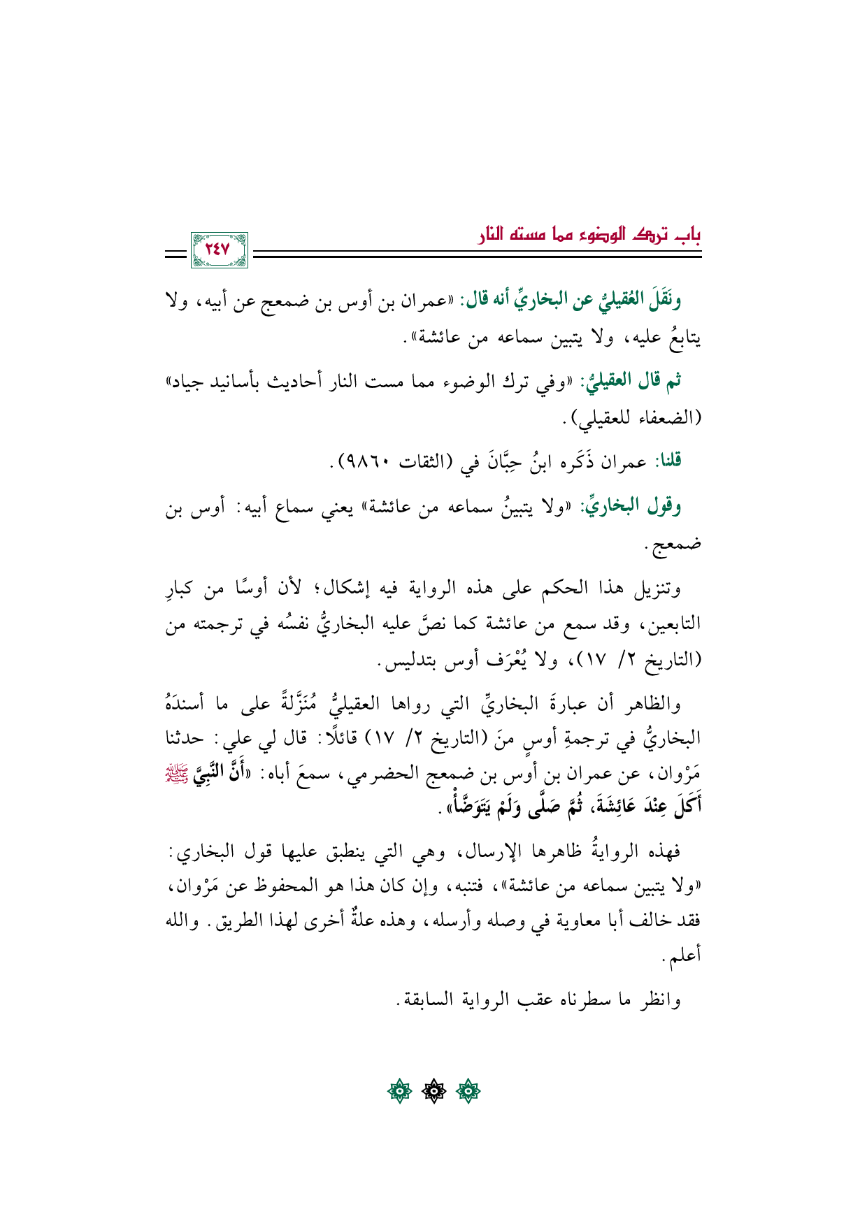 والظاهر أن عبارةَ البخاريِّ التي رواها العقيليُّ مُنَزَّلةً على ما أسندَهُ البخاريُّ في ترجمةِ أوسٍ منَ (التاريخ ٢/ ١٧) قائلًا: قال لي علي: حدثنا مَرْوان، عن عمران بن أوس بن ضمعج الحضرمي، سمعَ أباه: ((أَنَّ النَّبِيَّ صلى الله عليه وسلم أَكَلَ عِنْدَ عَائِشَةَ، ثُمَّ صَلَّى وَلَمْ يَتَوَضَّأْ)).