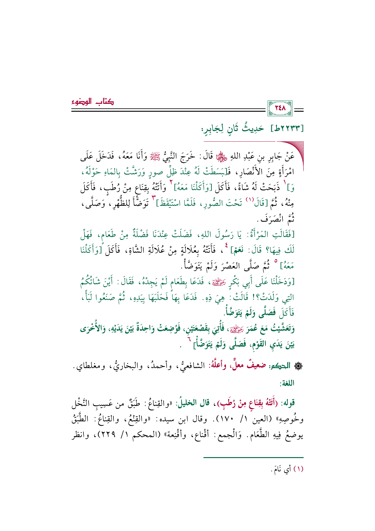 [فَقَالَتِ المَرْأَةُ: يَا رَسُولَ اللهِ، فَضَلَتْ عِنْدَنَا فَضْلَةٌ مِنْ طَعَامٍ، فَهَلْ لَكَ فِيهَا؟ قَالَ: نَعَمْ] ٤، فَأَتَتْهُ بِعُلَالَةٍ مِنْ عُلَالَةِ الشَّاةِ، فَأَكَلَ] وَأَكَلْنَا مَعَهُ] ٥ ثُمَّ صَلَّى العَصْرَ وَلَمْ يَتَوَضَّأْ.