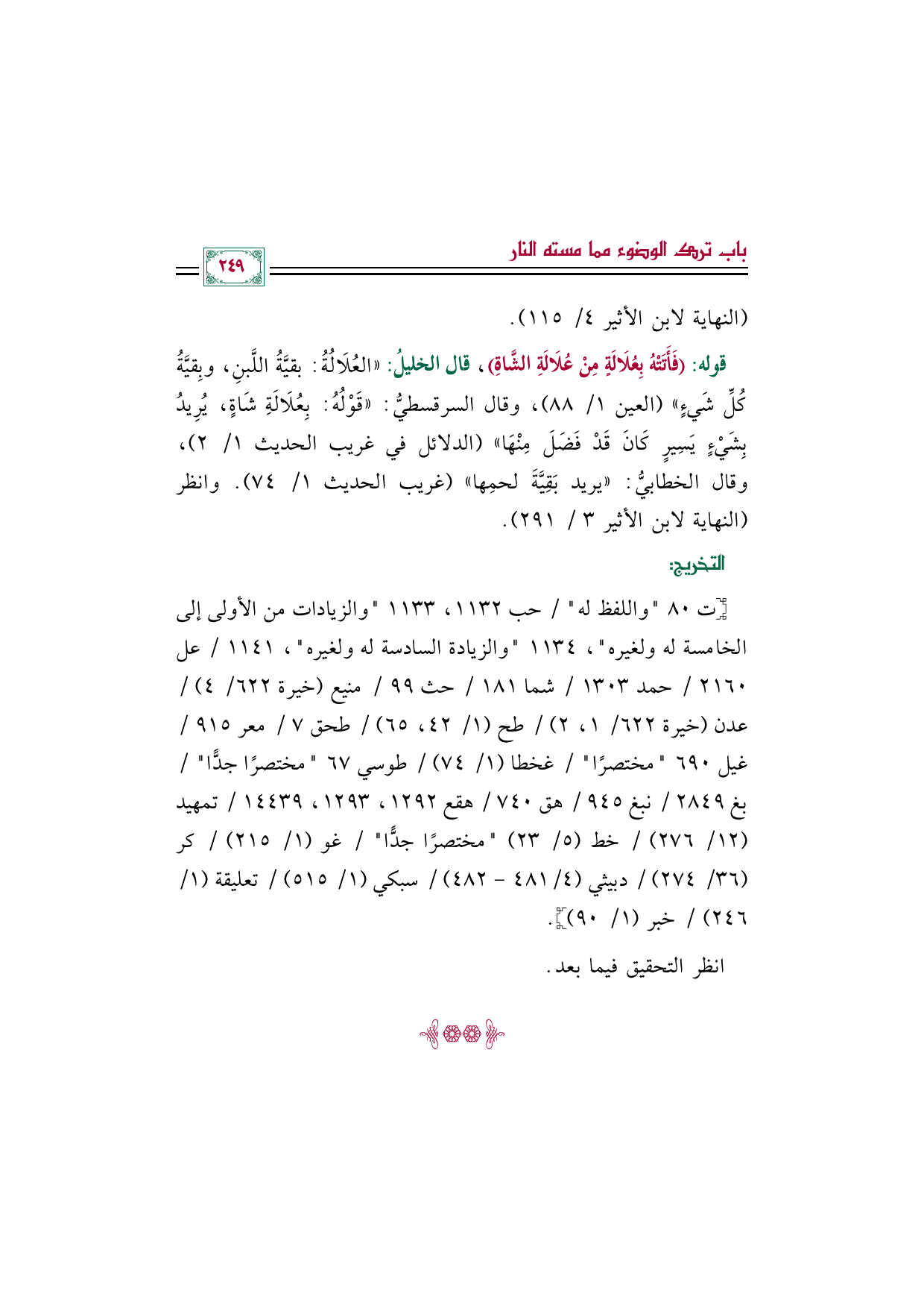 قوله: (فَأَتَتْهُ بِعُلَالَةٍ مِنْ عُلَالَةِ الشَّاةِ)، قال الخليلُ: " العُلَالُةُ: بقيَّةُ اللَّبنِ، وبِقيَّةُ كُلِّ شَيءٍ" (العين ١/ ٨٨)، وقال السرقسطيُّ: "قَوْلُهُ: بِعُلَالَةِ شَاةٍ، يُرِيدُ بِشَيْءٍ يَسِيرٍ كَانَ قَدْ فَضَلَ مِنْهَا" (الدلائل في غريب الحديث ١/ ٢)، وقال الخطابيُّ: "يريد بَقِيَّةَ لحمِها" (غريب الحديث ١/ ٧٤). وانظر (النهاية لابن الأثير ٣/ ٢٩١).
