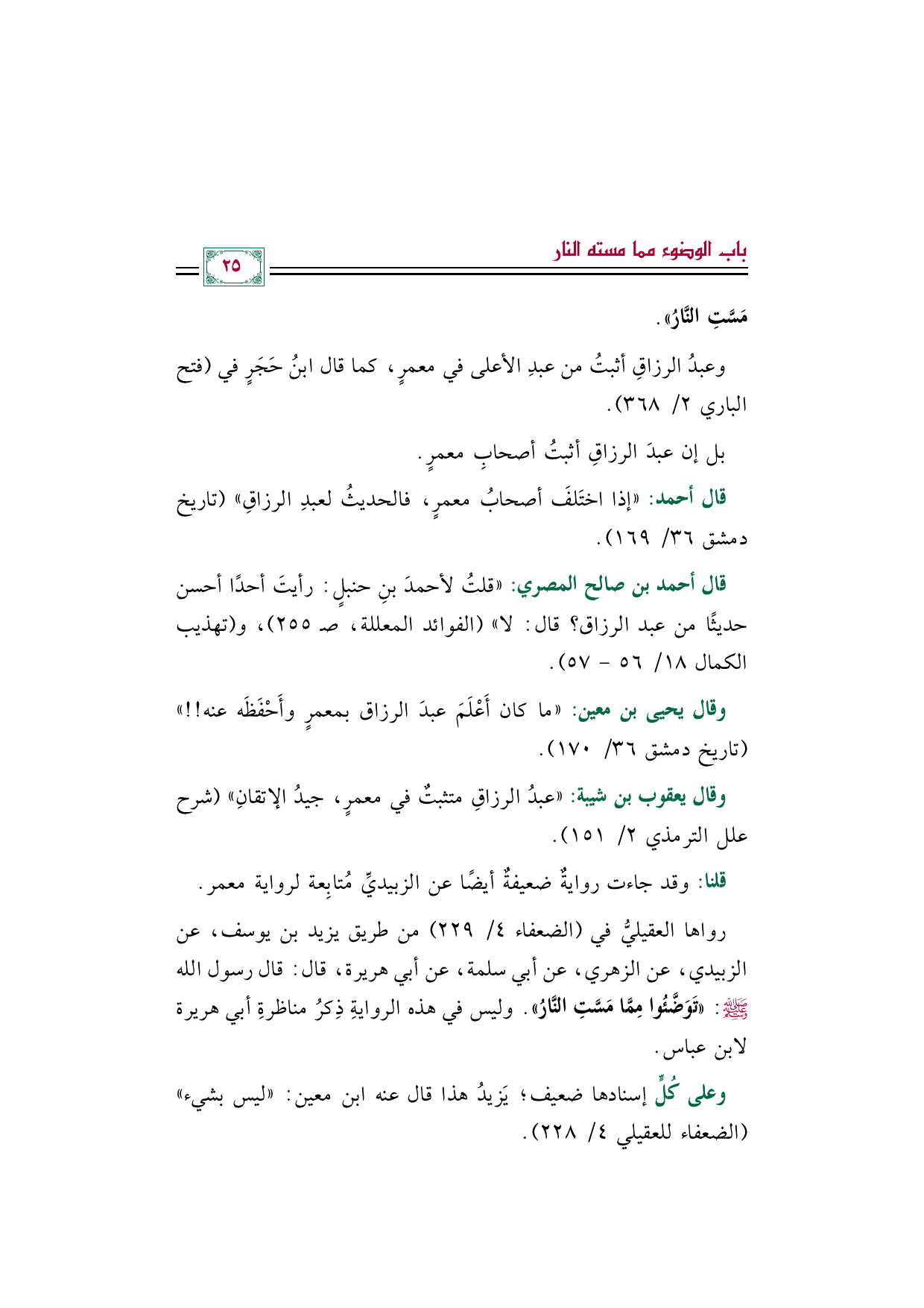 رواها العقيليُّ في (الضعفاء ٤/ ٢٢٩) من طريق يزيد بن يوسف، عن الزبيدي، عن الزهري، عن أبي سلمة، عن أبي هريرة، قال: قال رسول الله صلى الله عليه وسلم: ((تَوَضَّئُوا مِمَّا مَسَّتِ النَّارُ)). وليس في هذه الروايةِ ذِكرُ مناظرةِ أبي هريرة لابن عباس.