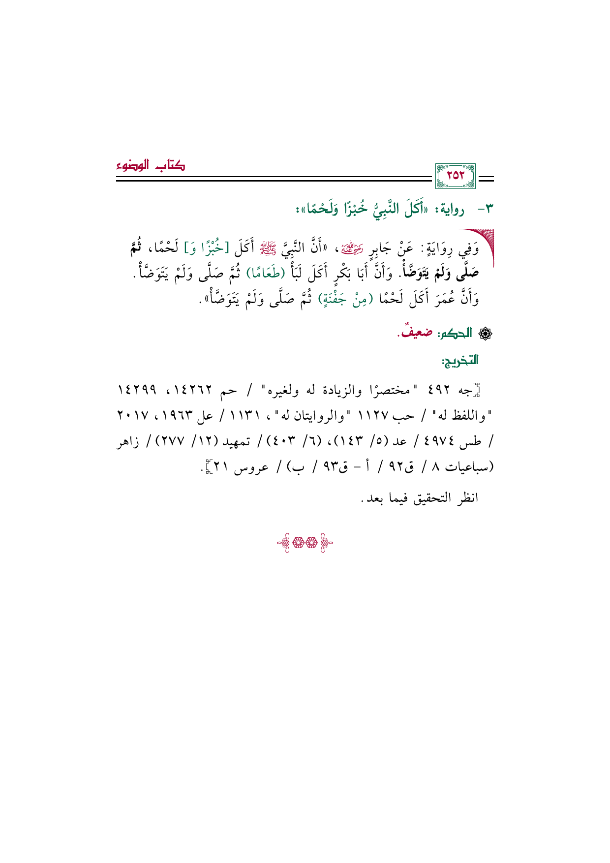 • وَفِي رِوَايَةٍ: عَنْ جَابِرٍ رضي الله عنه، ((أَنَّ النَّبِيَّ صلى الله عليه وسلم أَكَلَ [خُبْزًا وَ] لَحْمًا، ثُمَّ صَلَّى وَلَمْ يَتَوَضَّأْ. وَأَنَّ أَبَا بَكْرٍ أَكَلَ لَبَأً (طَعَامًا) ثُمَّ صَلَّى وَلَمْ يَتَوَضَّأْ. وَأَنَّ عُمَرَ أَكَلَ لَحْمًا (مِنْ جَفْنَةٍ) ثُمَّ صَلَّى وَلَمْ يَتَوَضَّأْ)).