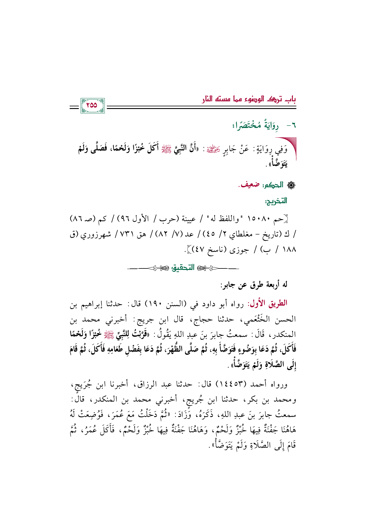 ورواه أحمد (١٤٤٥٣) قال: حدثنا عبد الرزاق، أخبرنا ابن جُرَيجٍ، ومحمد بن بكر، حدثنا ابن جُريجٍ، أخبرني محمد بن المنكدر، قال: سمعتُ جابرَ بنَ عبدِ اللهِ، ذَكَرَهُ، وَزَادَ: ((ثُمَّ دَخَلْتُ مَعَ عُمَرَ، فَوُضِعَتْ لَهُ هَاهُنَا جَفْنَةٌ فِيهَا خُبْزٌ وَلَحْمٌ، وَهَاهُنَا جَفْنَةٌ فِيهَا خُبْزٌ وَلَحْمٌ، فَأَكَلَ عُمَرُ، ثُمَّ قَامَ إِلَى الصَّلَاةِ وَلَمْ يَتَوَضَّأْ)).