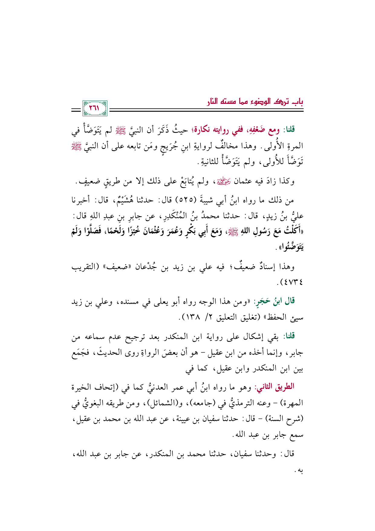 من ذلك ما رواه ابنُ أبي شيبةَ (٥٢٥) قال: حدثنا هُشَيْمٌ، قال: أخبرنا عليُّ بنُ زيدٍ، قال: حدثنا محمدُ بنُ المُنْكَدِرِ، عن جابرِ بنِ عبدِ اللهِ قال: ((أَكَلْتُ مَعَ رَسُولِ اللهِ صلى الله عليه وسلم، وَمَعَ أَبِي بَكْرٍ وَعُمَرَ وَعُثْمَانَ خُبْزًا وَلَحْمًا، فَصَلَّوْا وَلَمْ يَتَوَضَّئُوا)).