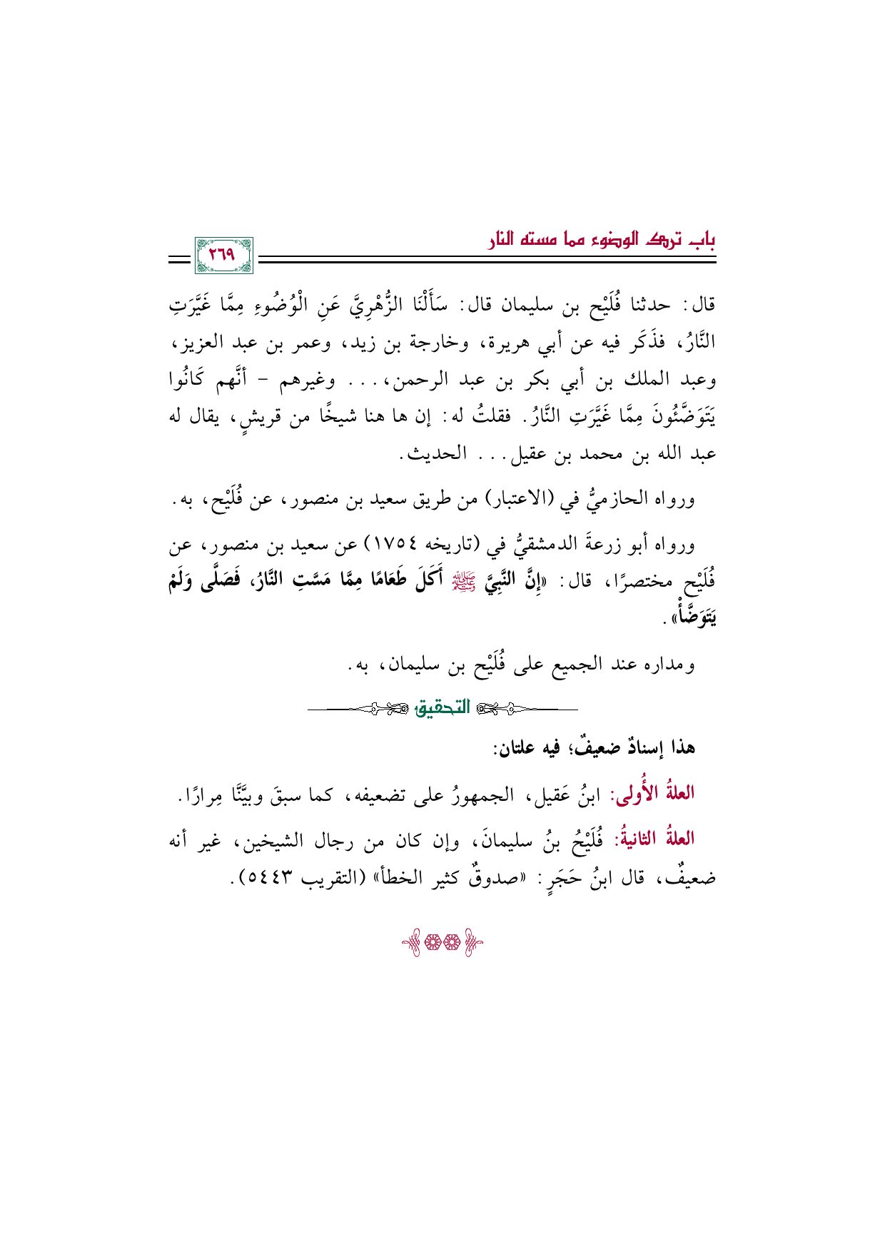 قال: حدثنا فُلَيْح بن سليمان قال: سَأَلْنَا الزُّهْرِيَّ عَنِ الْوُضُوءِ مِمَّا غَيَّرَتِ النَّارُ، فذَكَر فيه عن أبي هريرة، وخارجة بن زيد، وعمر بن عبد العزيز، وعبد الملك بن أبي بكر بن عبد الرحمن، ... وغيرهم- أنَّهم كَانُوا يَتَوَضَّئُونَ مِمَّا غَيَّرَتِ النَّارُ. فقلتُ له: إن ها هنا شيخًا من قريشٍ، يقال له عبد الله بن محمد بن عقيل ... الحديث.