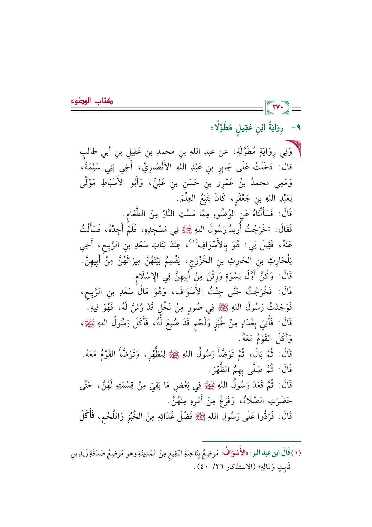 • وَفِي رِوَايَةٍ مُطَوَّلَةٍ: عن عبدِ اللهِ بنِ محمدِ بنِ عَقِيلِ بنِ أبي طالبٍ قال: دَخَلْتُ عَلَى جَابِرِ بنِ عَبْدِ اللهِ الأَنْصَارِيِّ، أَخِي بَنِي سَلِمَةَ، وَمَعِي محمدُ بنُ عَمْرِو بنِ حَسَنِ بنِ عَلِيٍّ، وَأَبُو الأَسْبَاطِ مَوْلًى لِعَبْدِ اللهِ بنِ جَعْفَرٍ، كَانَ يَتْبَعُ العِلْمَ.