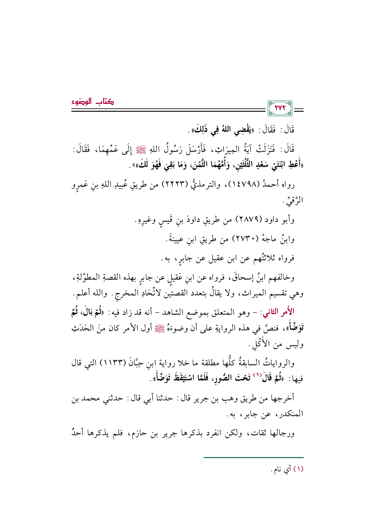 قَالَ: فَنَزَلَتْ آيَةُ المِيرَاثِ، فَأَرْسَلَ رَسُولُ اللهِ صلى الله عليه وسلم إِلَى عَمِّهِمَا، فَقَالَ: «أَعْطِ ابْنَتَيْ سَعْدٍ الثُّلُثَيْنِ، وَأُمَّهُمَا الثُّمُنَ، وَمَا بَقِيَ فَهُوَ لَكَ»)).