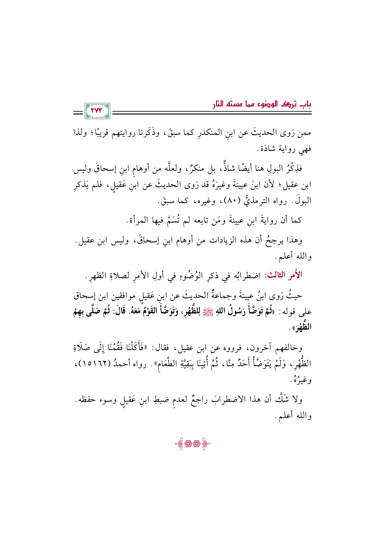 فذِكْرُ البولِ هنا أيضًا شاذٌّ، بل منكرٌ، ولعلَّه من أوهامِ ابنِ إسحاقَ وليس ابن عقيل؛ لأن ابنَ عيينةَ وغيرَهُ قد رَوى الحديثَ عن ابنِ عَقيلٍ، فلم يَذكرِ البولَ. رواه الترمذيُّ (٨٠)، وغيره، كما سبقَ.