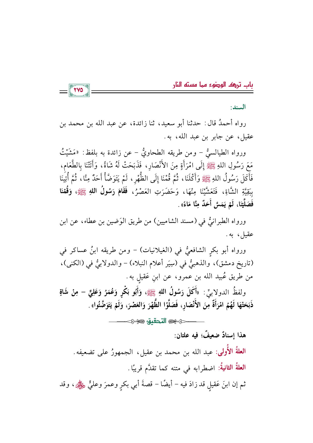 ورواه الطيالسيُّ -ومن طريقه الطحاويُّ- عن زائدة به بلفظ: ((مَشَيْتُ مَعَ رَسُولِ اللهِ صلى الله عليه وسلم إِلَى امْرَأَةٍ مِنَ الأَنْصَارِ، فَذَبَحَتْ لَهُ شَاةً، وَأَتَتْنَا بِالطَّعَامِ، فَأَكَلَ رَسُولُ اللهِ صلى الله عليه وسلم وَأَكْلَنَا، ثُمَّ قُمْنَا إِلَى الظُّهْرِ، لَمْ يَتَوَضَّأْ أَحَدٌ مِنَّا، ثُمَّ أُتِينَا بِبَقِيَّةِ الشَّاةِ، فَتَعَشَّيْنَا مِنْهَا، وَحَضَرَتِ العَصْرُ، فَقَامَ رَسُولُ اللهِ صلى الله عليه وسلم، وَقُمْنَا فَصَلَّيْنَا، لَمْ يَمَسَّ أَحَدٌ مِنَّا مَاءً)).
