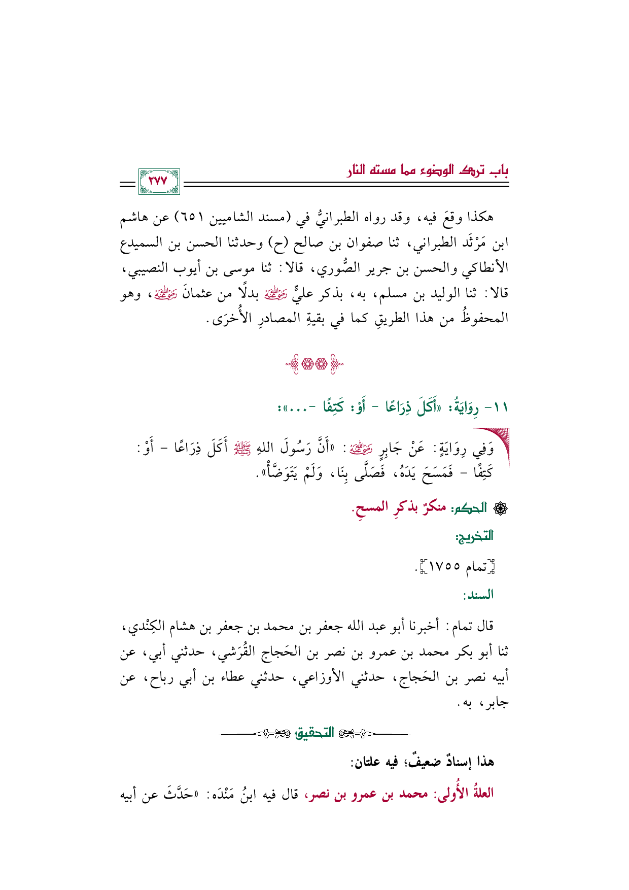 قال تمام: أخبرنا أبو عبد الله جعفر بن محمد بن جعفر بن هشام الكِنْدي، ثنا أبو بكر محمد بن عمرو بن نصر بن الحَجاج القُرَشي، حدثني أبي، عن أبيه نصر بن الحَجاج، حدثني الأوزاعي، حدثني عطاء بن أبي رباح، عن جابر، به.