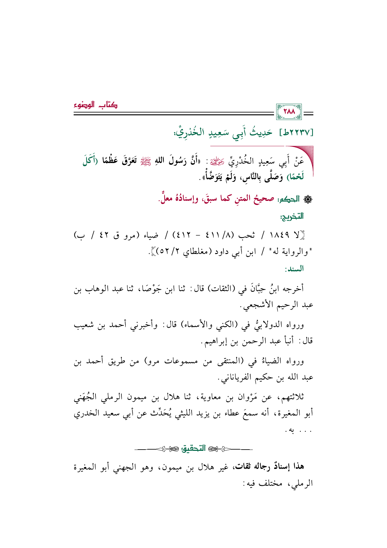 • عَنْ أَبِي سَعِيدٍ الخُدْرِيِّ رضي الله عنه: ((أَنَّ رَسُولَ اللهِ صلى الله عليه وسلم تَعَرَّقَ عَظْمًا (أَكَلَ لَحْمًا) وَصَلَّى بِالنَّاسِ، وَلَمْ يَتَوَضَّأْ)).