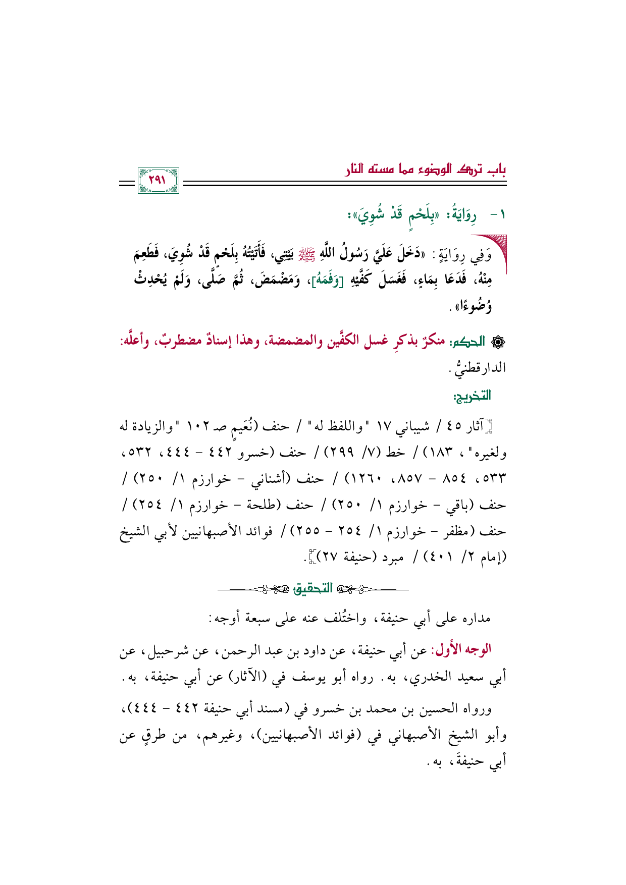 الوجه الأول: عن أبي حنيفة، عن داود بن عبد الرحمن، عن شرحبيل، عن أبي سعيد الخدري، به. رواه أبو يوسف في (الآثار) عن أبي حنيفة، به.