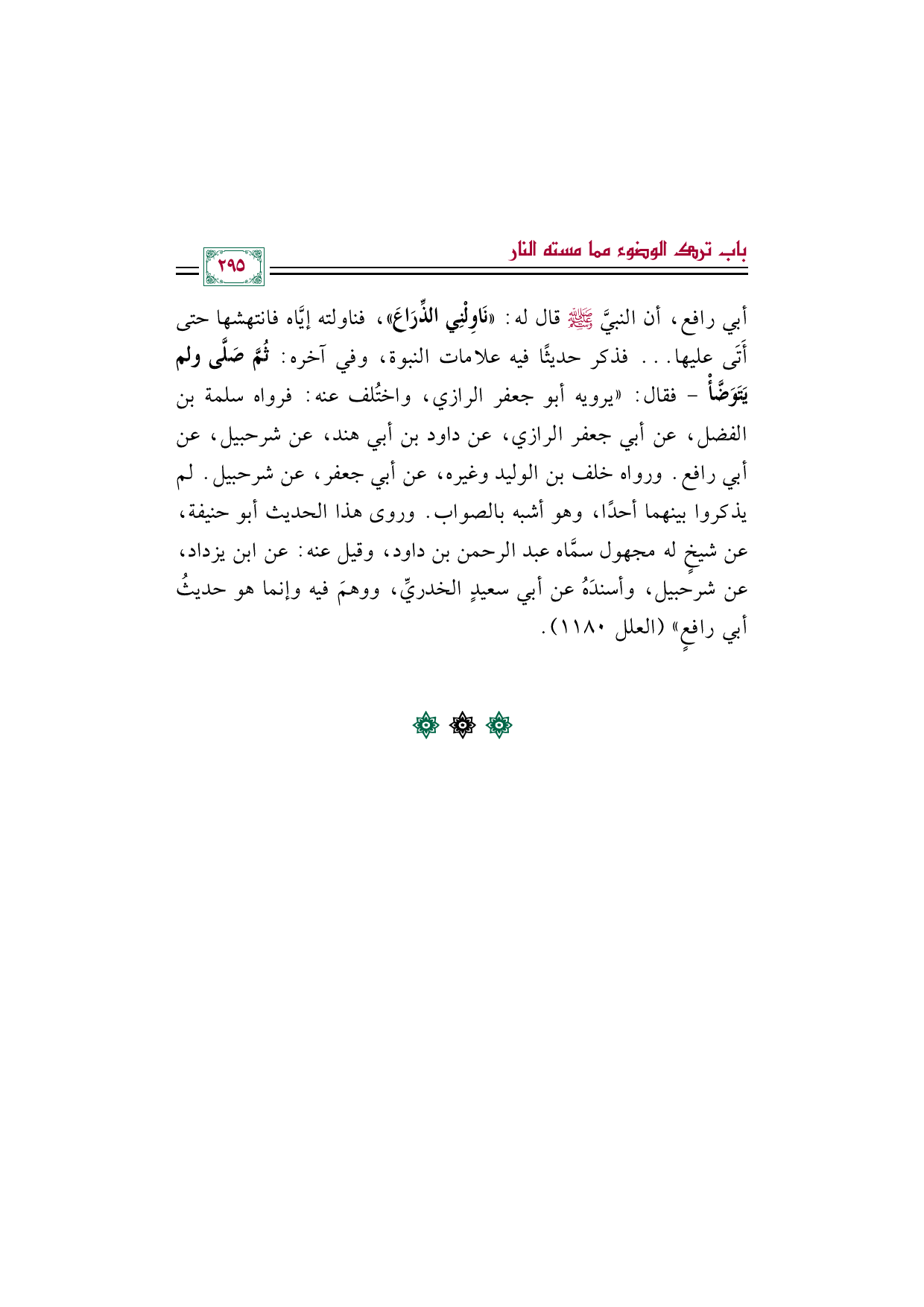 أبي رافع، أن النبيَّ صلى الله عليه وسلم قال له: «نَاوِلْنِي الذِّرَاعَ»، فناولته إيَّاه فانتهشها حتى أَتَى عليها ... فذكر حديثًا فيه علامات النبوة، وفي آخره: ثُمَّ صَلَّى ولم يَتَوَضَّأْ- فقال: ((يرويه أبو جعفر الرازي، واختُلف عنه: فرواه سلمة بن الفضل، عن أبي جعفر الرازي، عن داود بن أبي هند، عن شرحبيل، عن أبي رافع. ورواه خلف بن الوليد وغيره، عن أبي جعفر، عن شرحبيل. لم يذكروا بينهما أحدًا، وهو أشبه بالصواب. وروى هذا الحديث أبو حنيفة، عن شيخٍ له مجهول سمَّاه عبد الرحمن بن داود، وقيل عنه: عن ابن يزداد، عن شرحبيل، وأسندَهُ عن أبي سعيدٍ الخدريِّ، ووهمَ فيه وإنما هو حديثُ أبي رافعٍ)) (العلل ١١٨٠).