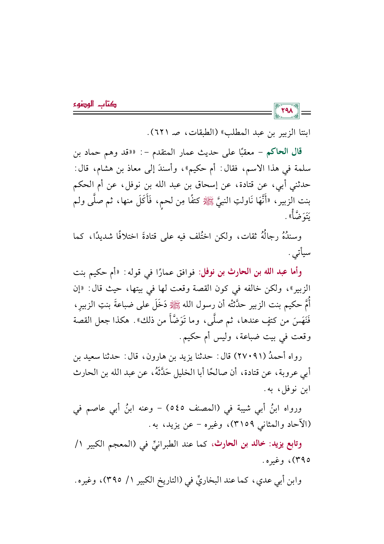 قال الحاكم -معقبًا على حديث عمار المتقدم-: ((((قد وهم حماد بن سلمة في هذا الاسم، فقال: أم حكيم))، وأسندَ إلى معاذ بن هشام، قال: حدثني أبي، عن قتادة، عن إسحاق بن عبد الله بن نوفل، عن أم الحكم بنت الزبير، ((أَنَّهَا نَاولتِ النبيَّ صلى الله عليه وسلم كتفًا مِن لحمٍ، فَأَكَلَ منها، ثم صلَّى ولم يَتَوَضَّأْ)).