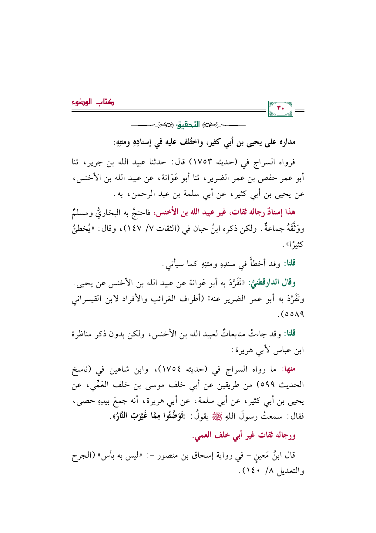فرواه السراج في (حديثه ١٧٥٣) قال: حدثنا عبيد الله بن جرير، ثنا أبو عمر حفص بن عمر الضرير، ثنا أبو عَوَانة، عن عبيد الله بن الأخنس، عن يحيى بن أبي كثير، عن أبي سلمة بن عبد الرحمن، به.