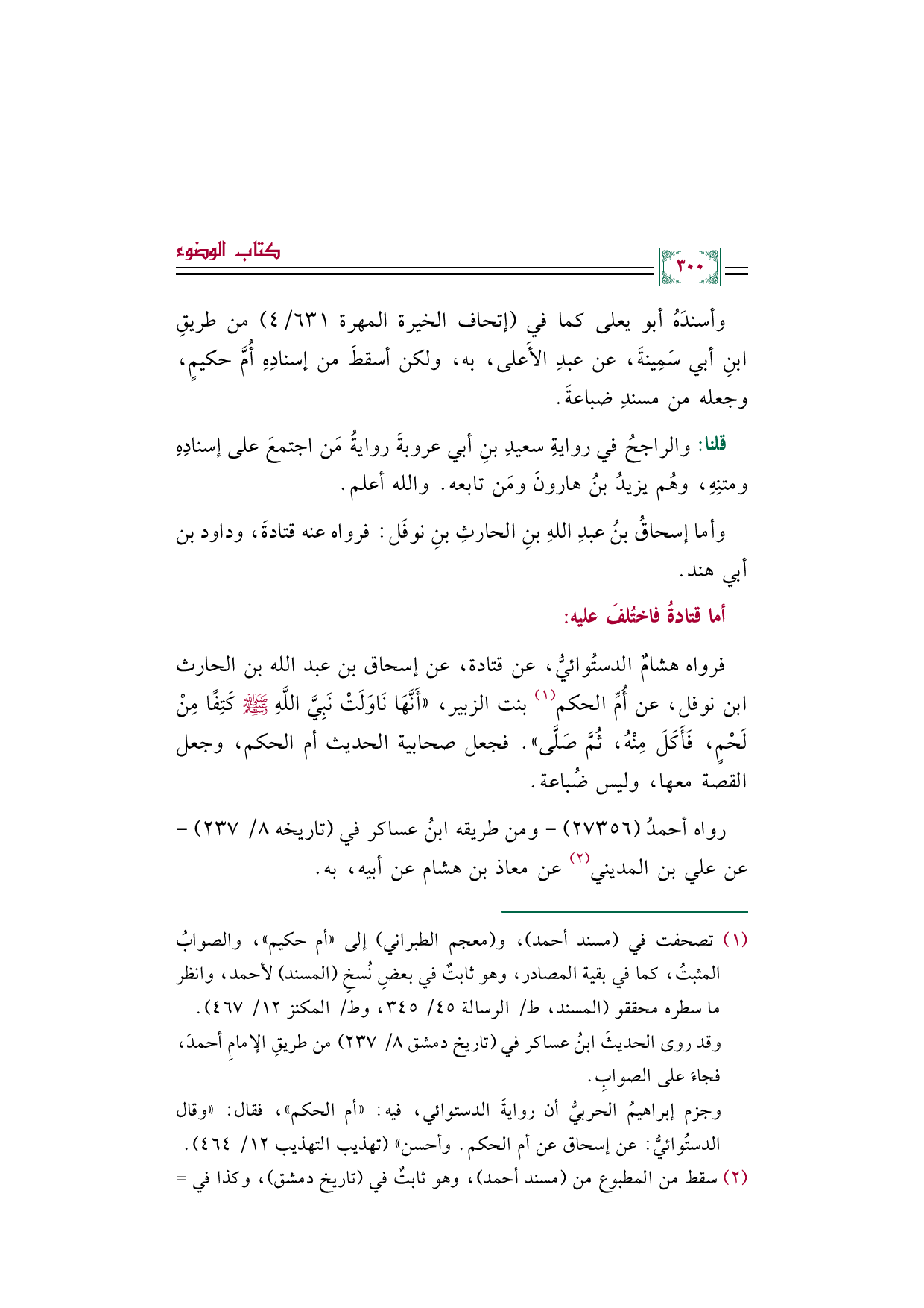 فرواه هشامٌ الدستُوائيُّ، عن قتادة، عن إسحاق بن عبد الله بن الحارث بن نوفل، عن أُمِّ الحكم (¬١)