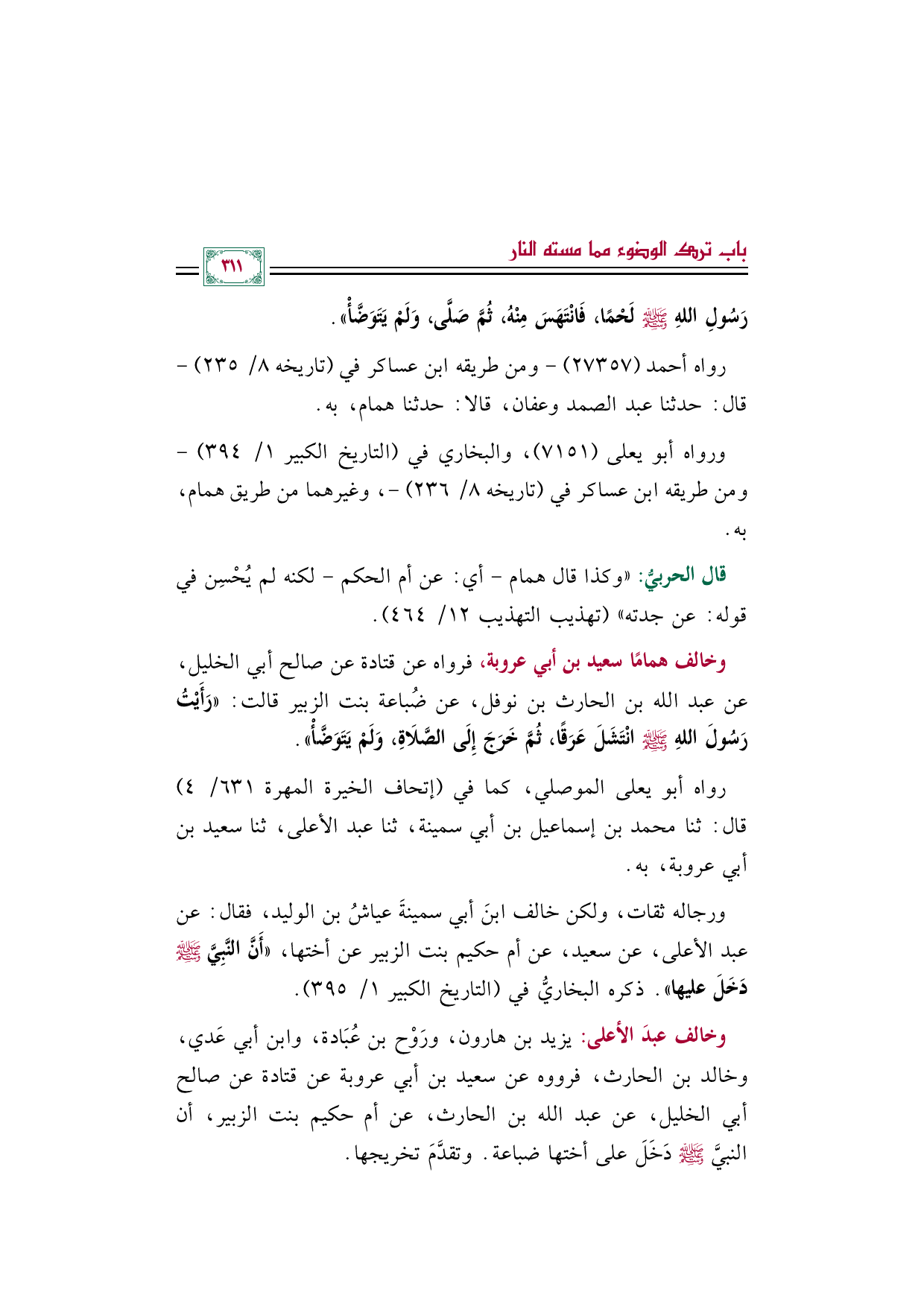 وخالف همامًا سعيد بن أبي عروبة، فرواه عن قتادة عن صالح أبي الخليل، عن عبد الله بن الحارث بن نوفل، عن ضُباعة بنت الزبير قالت: ((رَأَيْتُ رَسُولَ اللهِ صلى الله عليه وسلم انْتَشَلَ عَرَقًا، ثُمَّ خَرَجَ إِلَى الصَّلَاةِ، وَلَمْ يَتَوَضَّأْ)).