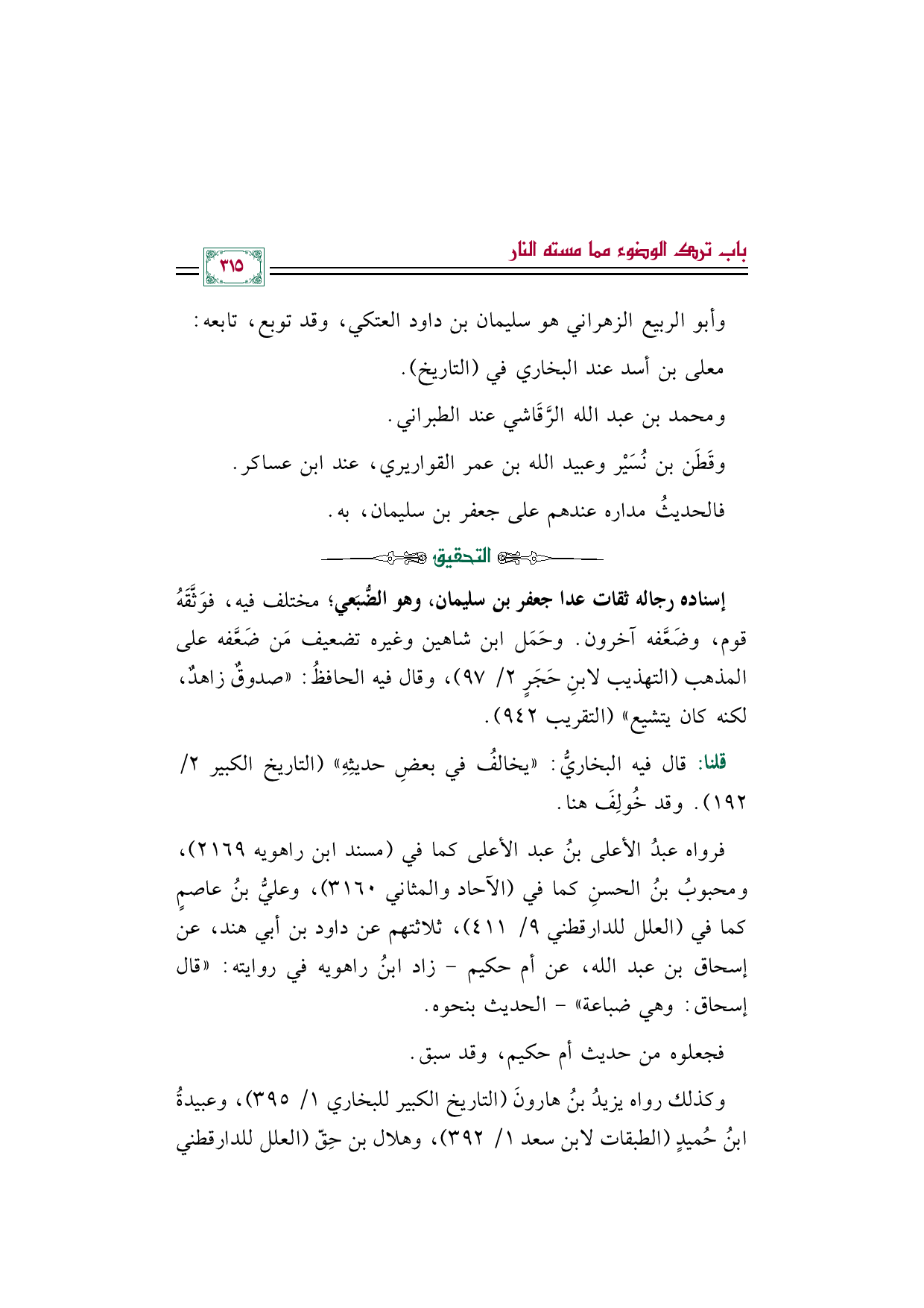 إسناده رجاله ثقات عدا جعفر بن سليمان، وهو الضُّبَعي؛ مختلف فيه، فوَثَّقَهُ قوم، وضَعَّفه آخرون. وحَمَل ابن شاهين وغيره تضعيف مَن ضَعَّفه على المذهب (التهذيب لابنِ حَجَرٍ ٢/ ٩٧)، وقال فيه الحافظُ: "صدوقٌ زاهدٌ، لكنه كان يتشيع" (التقريب ٩٤٢).