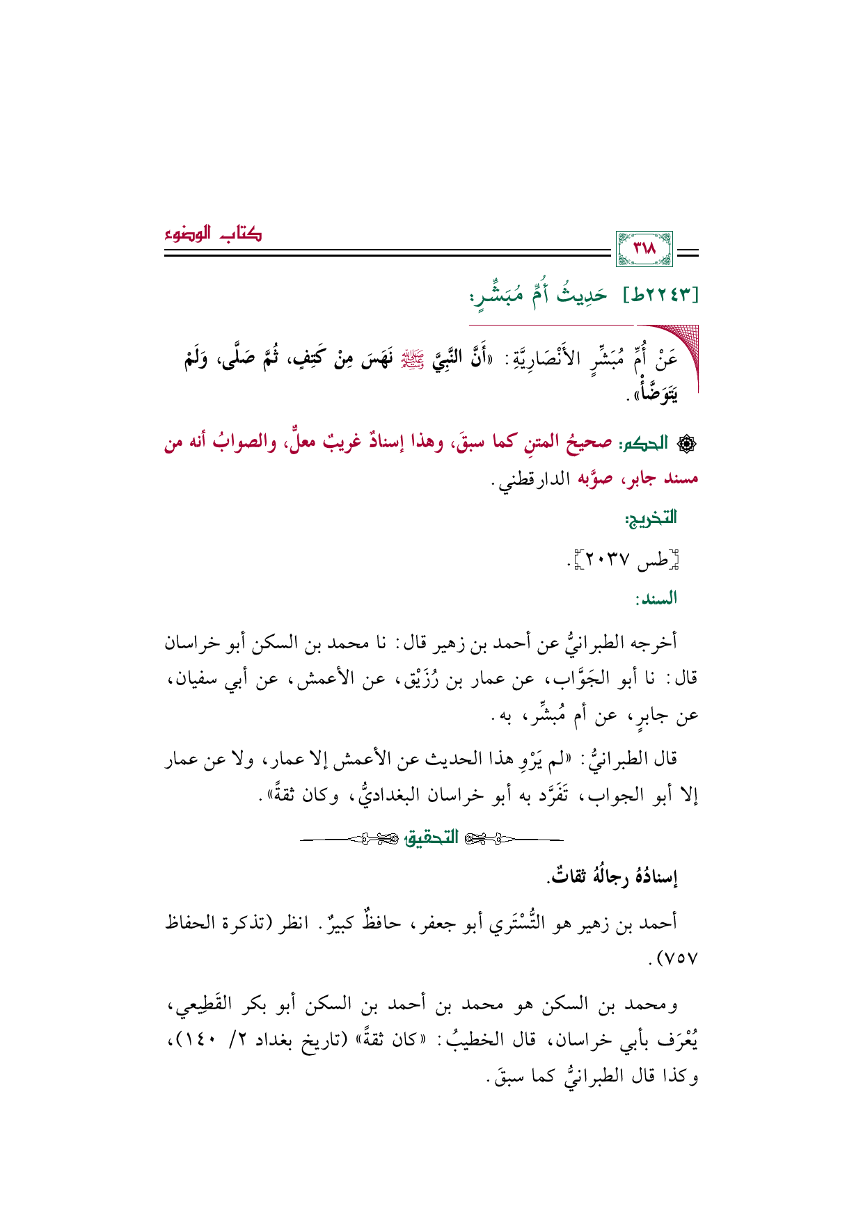 أخرجه الطبرانيُّ عن أحمد بن زهير قال: نا محمد بن السكن أبو خراسان قال: نا أبو الجَوَّاب، عن عمار بن رُزَيْق، عن الأعمش، عن أبي سفيان، عن جابرٍ، عن أم مُبشِّر، به.