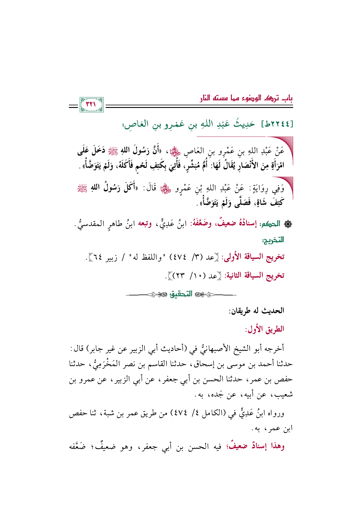 أخرجه أبو الشيخ الأصبهانيُّ في (أحاديث أبي الزبير عن غير جابر) قال: حدثنا أحمد بن موسى بن إسحاق، حدثنا القاسم بن نصر المَخْرَمِيُّ، حدثنا حفص بن عمر، حدثنا الحسن بن أبي جعفر، عن أبي الزبير، عن عمرو بن شعيب، عن أبيه، عن جَده، به.