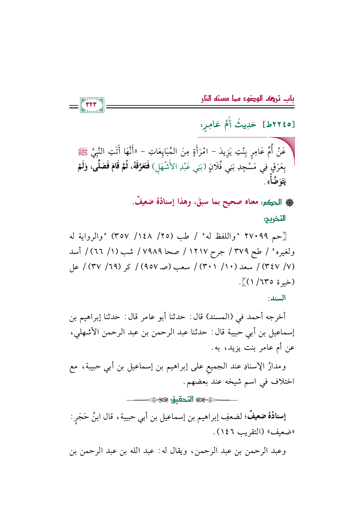 أخرجه أحمد في (المسند) قال: حدثنا أبو عامر قال: حدثنا إبراهيم بن إسماعيل بن أبي حبيبة قال: حدثنا عبد الرحمن بن عبد الرحمن الأشهلي، عن أم عامر بنت يزيد، به.
