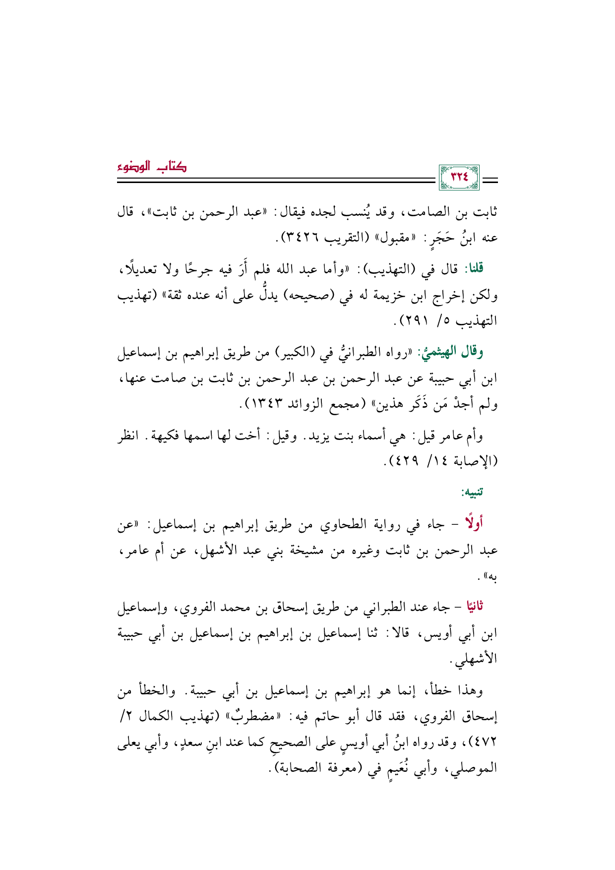 أولًا- جاء في رواية الطحاوي من طريق إبراهيم بن إسماعيل: "عن عبد الرحمن بن ثابت وغيره من مشيخة بني عبد الأشهل، عن أم عامر، به".