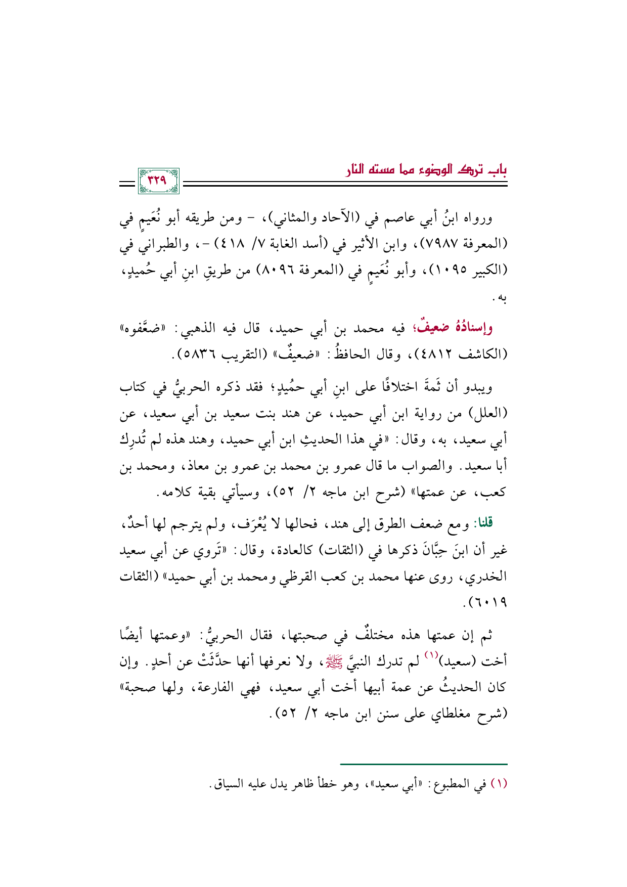 ويبدو أن ثَمةَ اختلافًا على ابنِ أبي حمُيدٍ؛ فقد ذكره الحربيُّ في كتاب (العلل) من رواية ابن أبي حميد، عن هند بنت سعيد بن أبي سعيد، عن أبي سعيد، به، وقال: "في هذا الحديثِ ابن أبي حميد، وهند هذه لم تُدرِك أبا سعيد. والصواب ما قال عمرو بن محمد بن عمرو بن معاذ، ومحمد بن كعب، عن عمتها" (شرح ابن ماجه ٢/ ٥٢)، وسيأتي بقية كلامه.