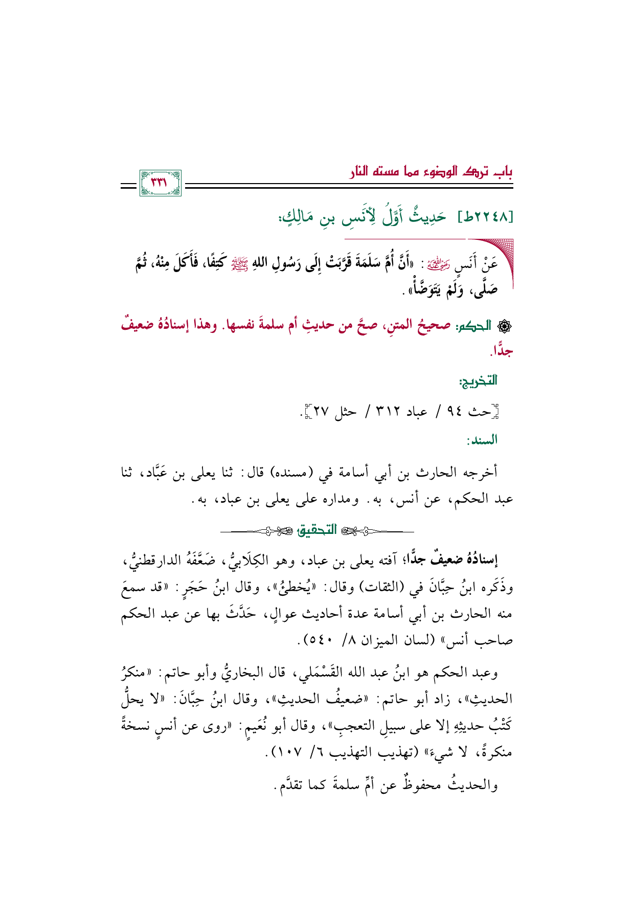 أخرجه الحارث بن أبي أسامة في (مسنده) قال: ثنا يعلى بن عَبَّاد، ثنا عبد الحكم، عن أنس، به. ومداره على يعلى بن عباد، به.
