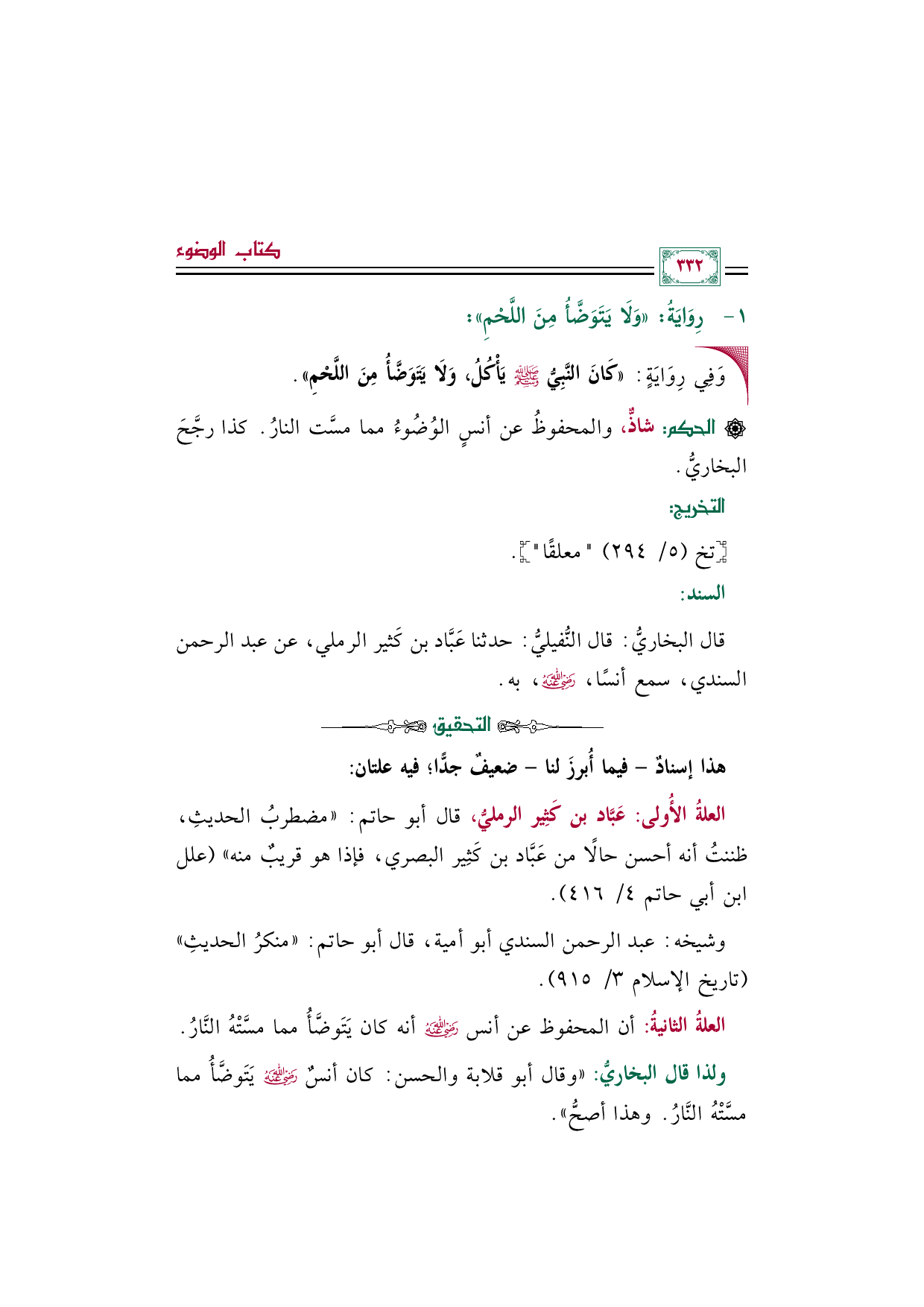 رِوَايَةُ ((وَلَا يَتَوَضَّأُ مِنَ اللَّحْمِ)):