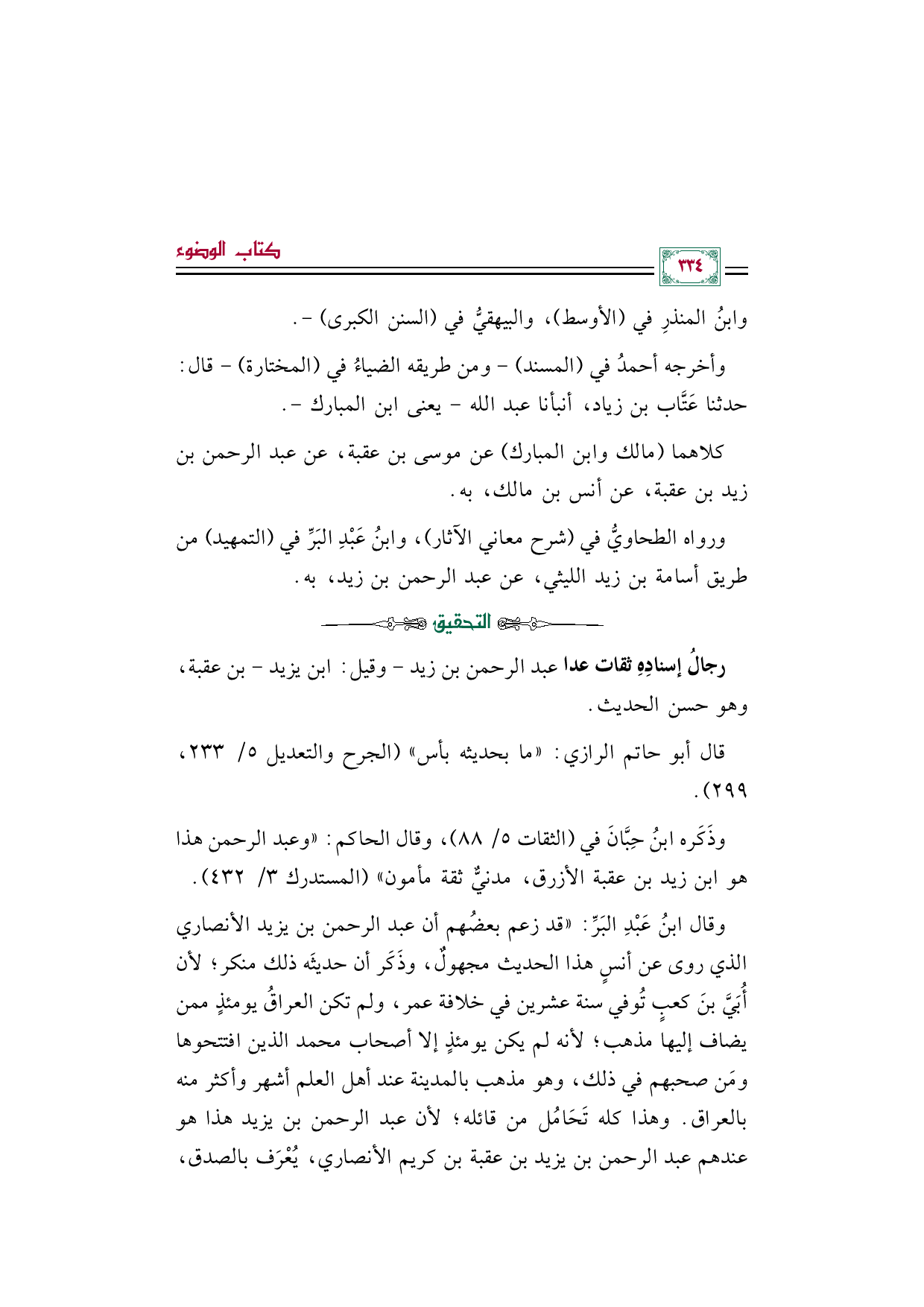 وقال ابنُ عَبْدِ البَرِّ: ((قد زعم بعضُهم أن عبد الرحمن بن يزيد الأنصاري الذي روى عن أنسٍ هذا الحديث مجهولٌ، وذَكَر أن حديثَه ذلك منكر؛ لأن أُبَيَّ بنَ كعبٍ تُوفي سنة عشرين في خلافة عمر، ولم تكن العراقُ يومئذٍ ممن يضاف إليها مذهب؛ لأنه لم يكن يومئذٍ إلا أصحاب محمد الذين افتتحوها ومَن صحبهم في ذلك، وهو مذهب بالمدينة عند أهل العلم أشهر وأكثر منه بالعراق. وهذا كله تَحَامُل من قائله؛ لأن عبد الرحمن بن يزيد هذا هو عندهم عبد الرحمن بن يزيد بن عقبة بن كريم الأنصاري، يُعْرَف بالصدق،