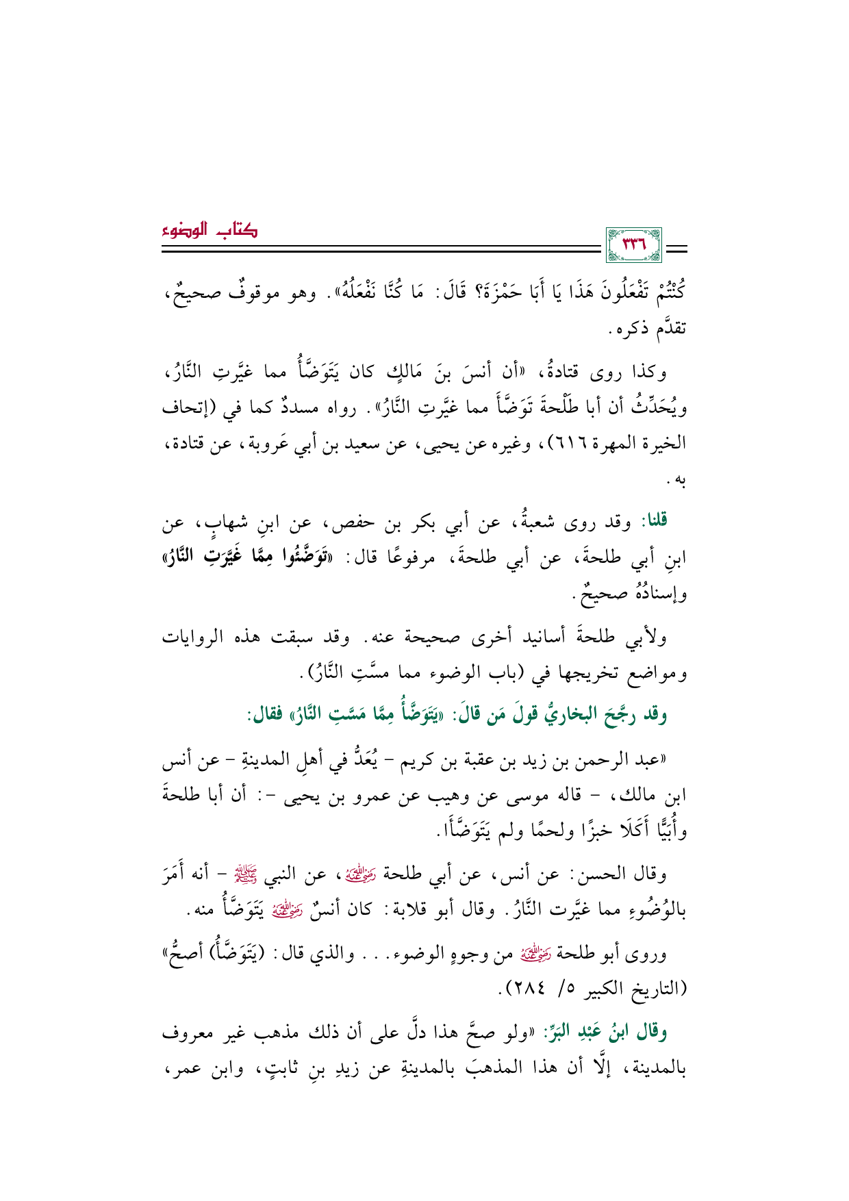 وكذا روى قتادةُ، ((أن أنسَ بنَ مَالكٍ كان يَتَوَضَّأُ مما غيَّرتِ النَّارُ، ويُحَدِّثُ أن أبا طَلْحةَ تَوَضَّأَ مما غيَّرتِ النَّارُ)). رواه مسددٌ كما في (إتحاف الخيرة المهرة ٦١٦)، وغيره عن يحيى، عن سعيد بن أبي عَروبة، عن قتادة، به.