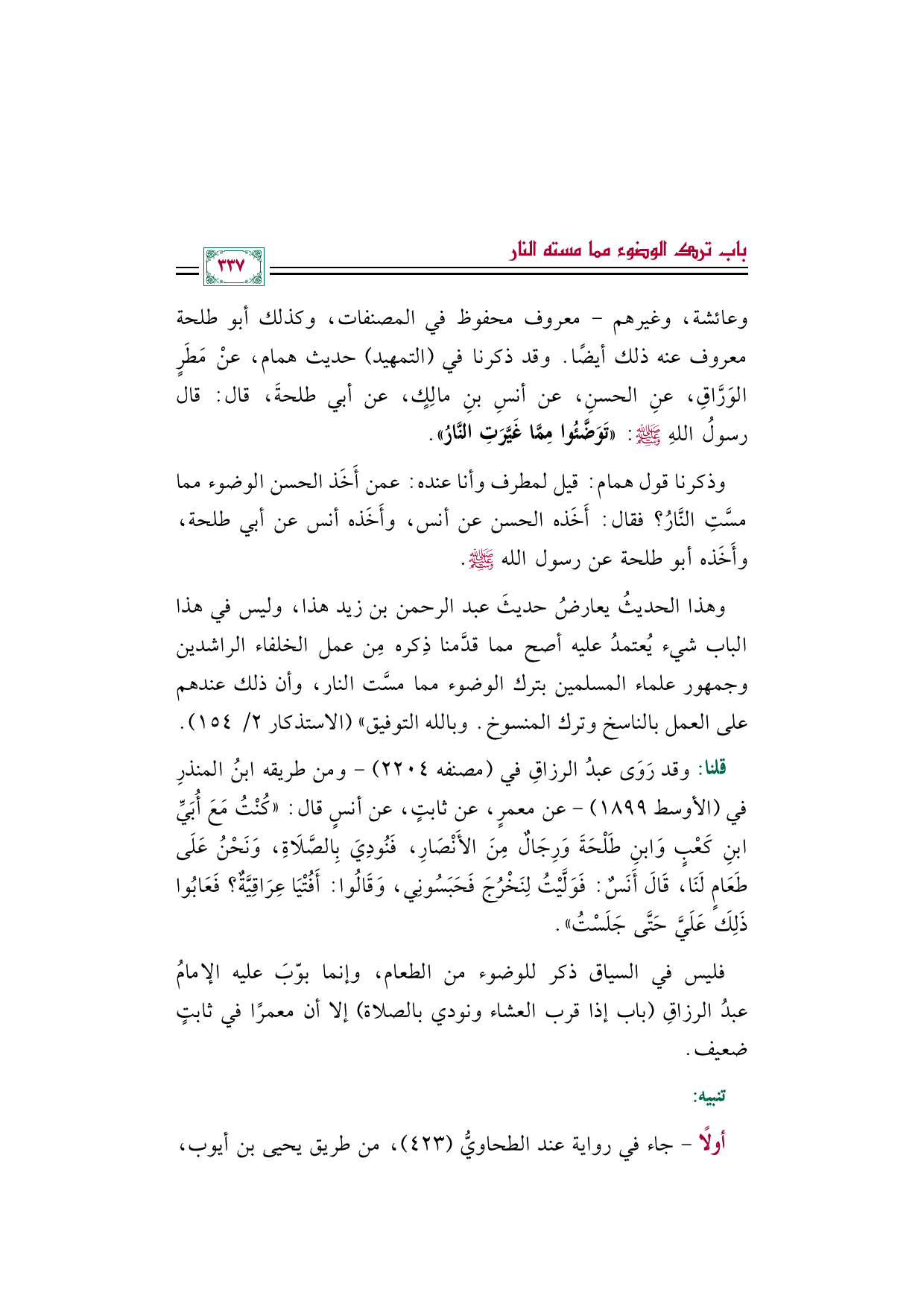 وعائشة، وغيرهم- معروف محفوظ في المصنفات، وكذلك أبو طلحة معروف عنه ذلك أيضًا. وقد ذكرنا في (التمهيد) حديث همام، عنْ مَطَرٍ الوَرَّاقِ، عنِ الحسنِ، عن أنسِ بنِ مالِكٍ، عن أبي طلحةَ، قال: قال رسولُ اللهِ صلى الله عليه وسلم: «تَوَضَّئُوا مِمَّا غَيَّرَتِ النَّارُ».