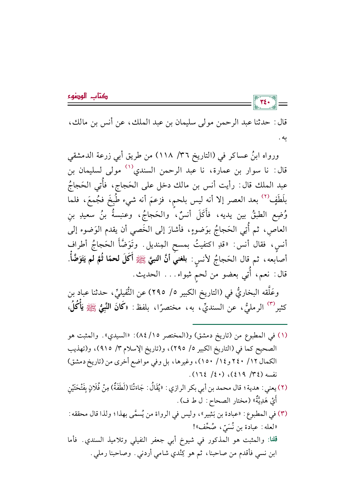 ورواه ابنُ عساكر في (التاريخ ٣٦/ ١١٨) من طريق أبي زرعة الدمشقي قال: نا سوار بن عمارة، نا عبد الرحمن السندي (¬١) مولى لسليمان بن عبد الملك قال: رأيت أنس بن مالك دخل على الحَجاج، فأُتِي الحَجاجُ بلَطَفٍ (¬٢) بعد العصر إلا أنه ليس بلحمٍ، فزعمَ أنه شيء طُبِخَ فجُمعَ، فلما وُضِع الطبقُ بين يديه، فأَكَلَ أنسٌ، والحَجاجُ، وعنبسةُ بنُ سعيدِ بنِ العاصِ، ثم أُتِي الحَجاجُ بوَضوءٍ، فأشارَ إلى الخَصي أن يقدم الوَضوء إلى أنسٍ، فقال أنس: ((قدِ اكتفيتُ بمسحِ المِنديل. وتَوَضَّأَ الحَجاجُ أطراف أصابعه، ثم قال الحَجاجُ لأنسٍ: بلغني أنَّ النبيَّ صلى الله عليه وسلم أَكَلَ لحمًا ثُمَّ لم يَتَوَضَّأْ. قال: نعم، أُتِي بعضو من لحمٍ شِواء ... الحديث.