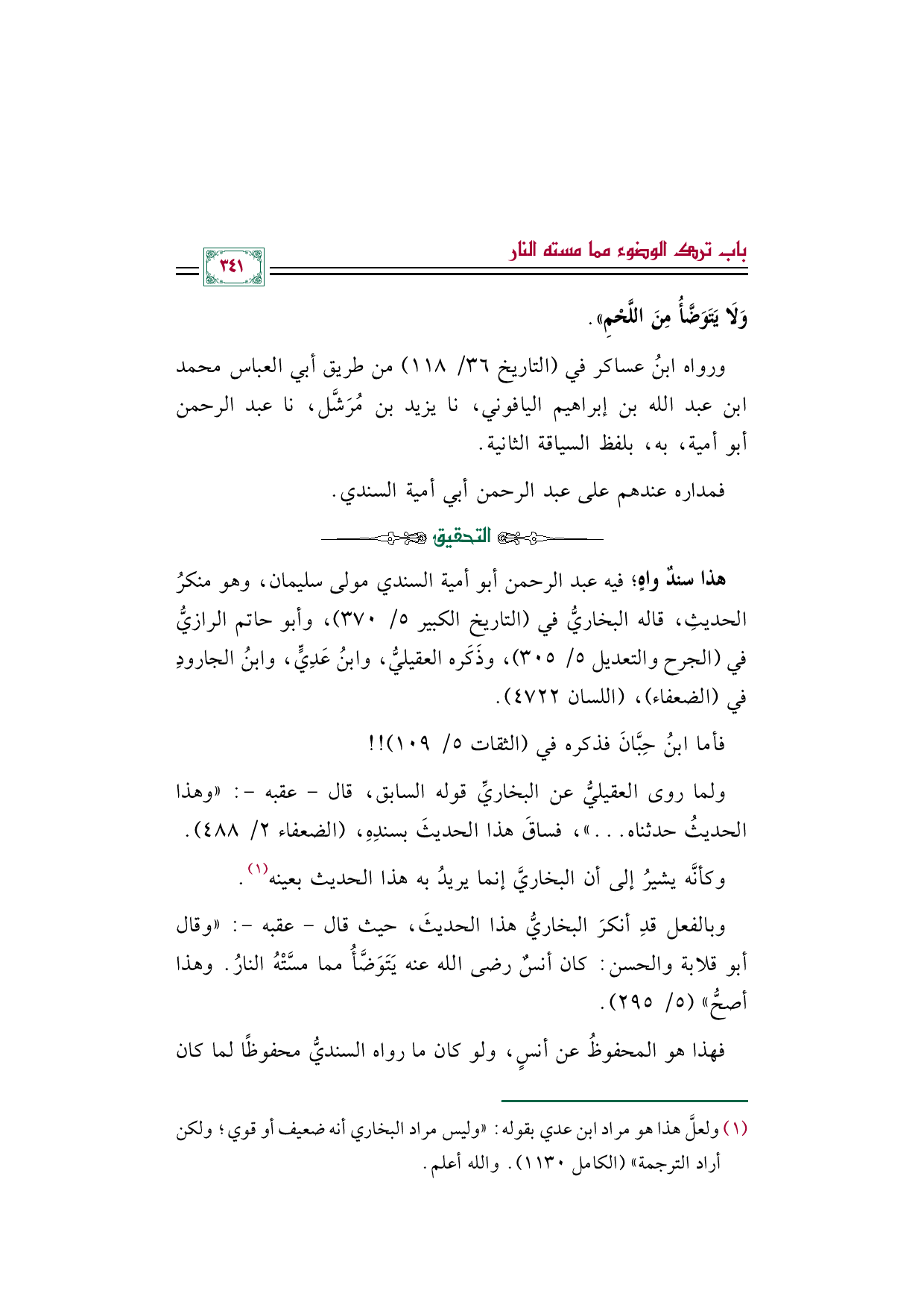 هذا سندٌ واهٍ؛ فيه عبد الرحمن أبو أمية السندي مولى سليمان، وهو منكرُ الحديثِ، قاله البخاريُّ في (التاريخ الكبير ٥/ ٣٧٠)، وأبو حاتم الرازيُّ في (الجرح والتعديل ٥/ ٣٠٥)، وذَكَره العقيليُّ، وابنُ عَدِيٍّ، وابنُ الجارودِ في (الضعفاء)، (اللسان ٤٧٢٢).
