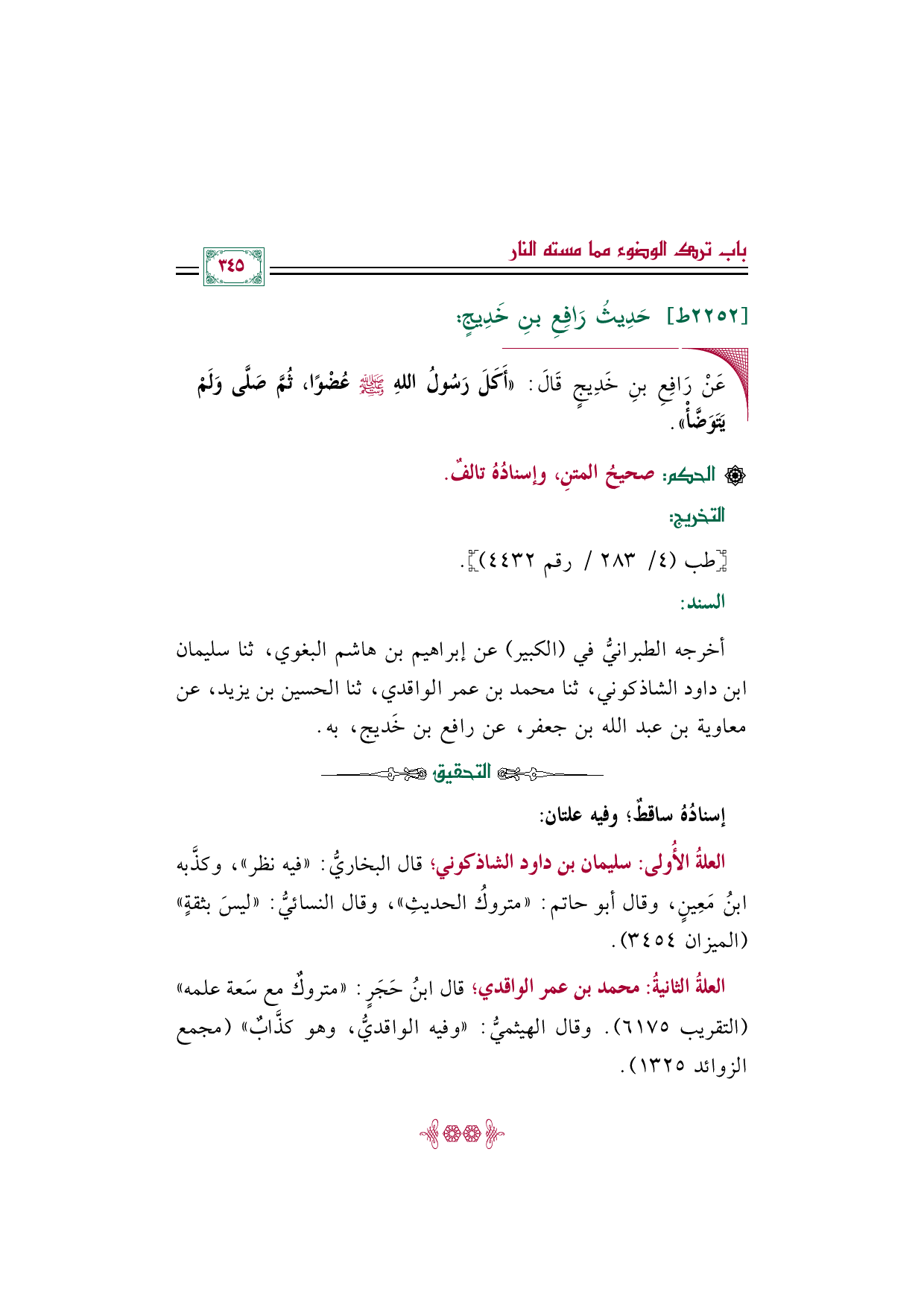 أخرجه الطبرانيُّ في (الكبير) عن إبراهيم بن هاشم البغوي، ثنا سليمان بن داود الشاذكوني، ثنا محمد بن عمر الواقدي، ثنا الحسين بن يزيد، عن معاوية بن عبد الله بن جعفر، عن رافع بن خَديج، به.