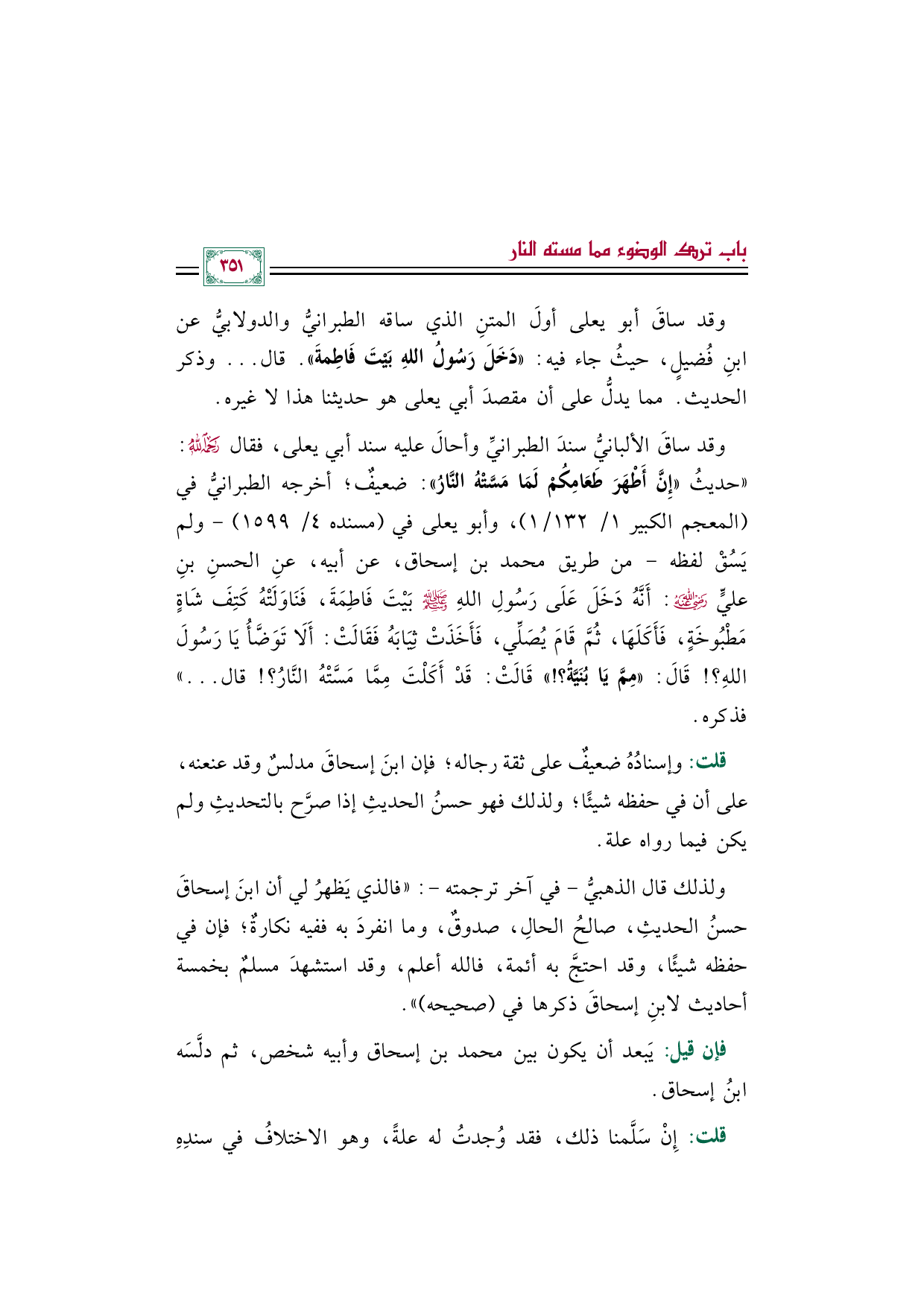 وقد ساقَ الألبانيُّ سندَ الطبرانيِّ وأحالَ عليه سند أبي يعلى، فقال رحمه الله: ((حديثُ ((إِنَّ أَطْهَرَ طَعَامِكُمْ لَمَا مَسَّتْهُ النَّارُ)): ضعيفٌ؛ أخرجه الطبرانيُّ في (المعجم الكبير ١/ ١٣٢/١)، وأبو يعلى في (مسنده ٤/ ١٥٩٩) -ولم يَسُقْ لفظه- من طريق محمد بن إسحاق، عن أبيه، عنِ الحسنِ بنِ عليٍّ رضي الله عنه: أَنَّهُ دَخَلَ عَلَى رَسُولِ اللهِ صلى الله عليه وسلم بَيْتَ فَاطِمَةَ، فَنَاوَلَتْهُ كَتِفَ شَاةٍ مَطْبُوخَةٍ، فَأَكَلَهَا، ثُمَّ قَامَ يُصَلِّي، فَأَخَذَتْ ثِيَابَهُ فَقَالَتْ: أَلَا تَوَضَّأُ يَا رَسُولَ اللهِ؟ ! قَالَ: «مِمَّ يَا بُنَيَّةُ؟ ! » قَالَتْ: قَدْ أَكَلْتَ مِمَّا مَسَّتْهُ النَّارُ؟ ! قال ... " فذكره.