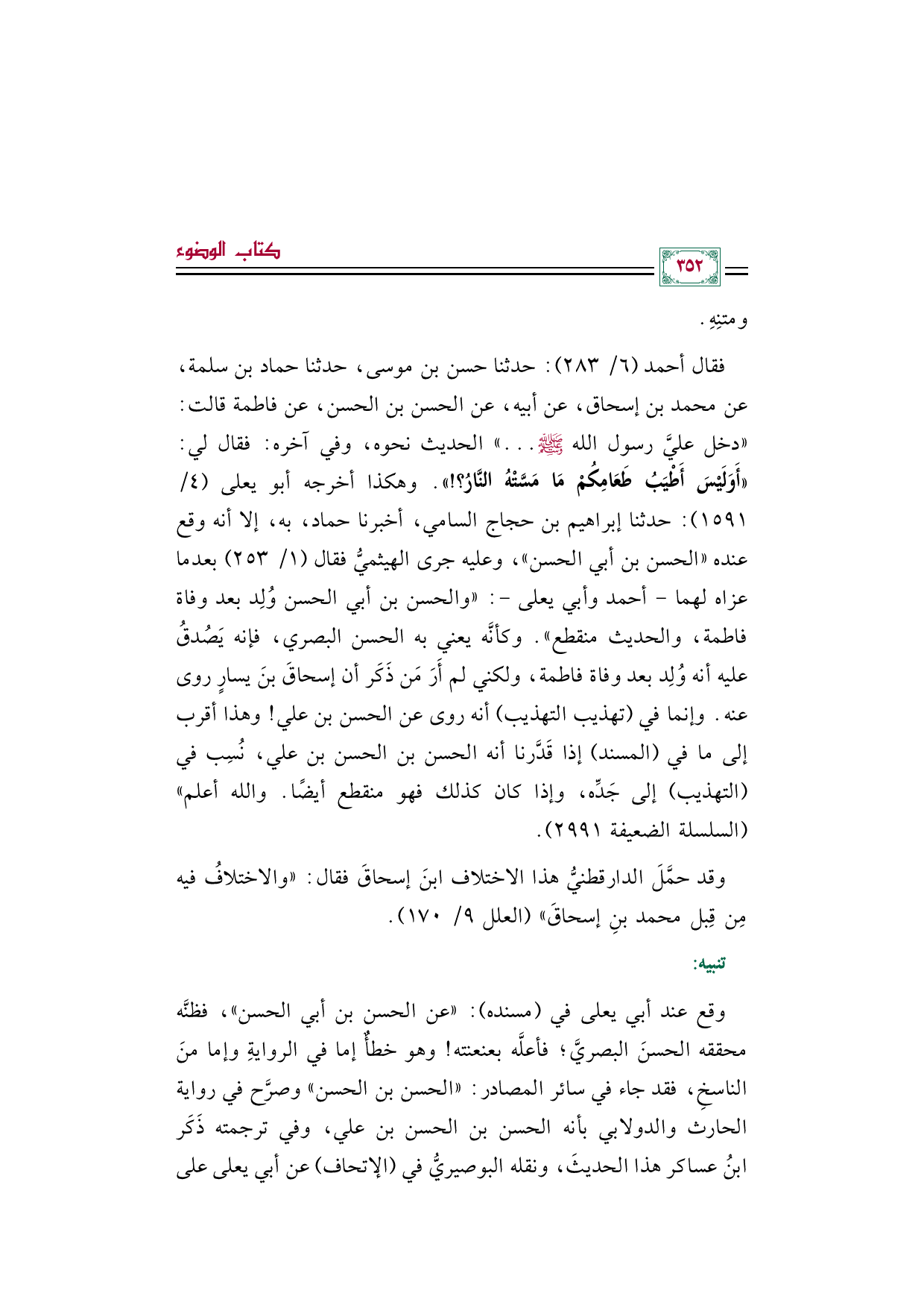 فقال أحمد (٦/ ٢٨٣): حدثنا حسن بن موسى، حدثنا حماد بن سلمة، عن محمد بن إسحاق، عن أبيه، عن الحسن بن الحسن، عن فاطمة قالت: دخل عليَّ رسول الله صلى الله عليه وسلم ... " الحديث نحوه، وفي آخره: فقال لي: «أَوَلَيْسَ أَطْيَبُ طَعَامِكُمْ مَا مَسَّتْهُ النَّارُ؟ ! ». وهكذا أخرجه أبو يعلى (٤/ ١٥٩١): حدثنا إبراهيم بن حجاج السامي، أخبرنا حماد، به، إلا أنه وقع عنده "الحسن بن أبي الحسن "، وعليه جرى الهيثميُّ فقال (١/ ٢٥٣) بعدما عزاه لهما -أحمد وأبي يعلى-: "والحسن بن أبي الحسن وُلِد بعد وفاة فاطمة، والحديث منقطع". وكأنَّه يعني به الحسن البصري، فإنه يَصُدقُ عليه أنه وُلِد بعد وفاة فاطمة، ولكني لم أَرَ مَن ذَكَر أن إسحاقَ بنَ يسارٍ روى عنه. وإنما في (تهذيب التهذيب) أنه روى عن الحسن بن علي! وهذا أقرب إلى ما في (المسند) إذا قَدَّرنا أنه الحسن بن الحسن بن علي، نُسِب في (التهذيب) إلى جَدِّه، وإذا كان كذلك فهو منقطع أيضًا. والله أعلم)) (السلسلة الضعيفة ٢٩٩١).