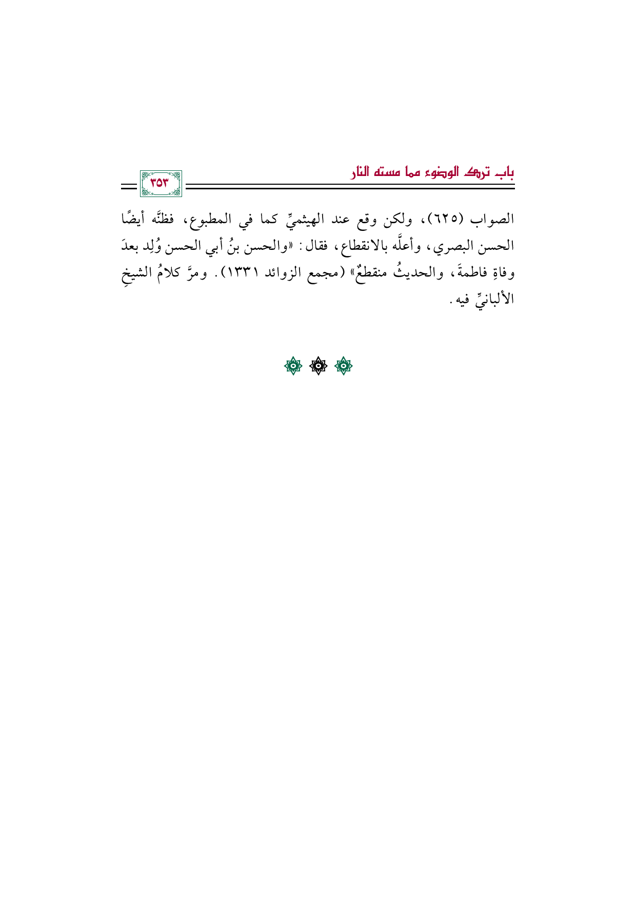 الصواب (٦٢٥)، ولكن وقع عند الهيثميِّ كما في المطبوع، فظنَّه أيضًا الحسن البصري، وأعلَّه بالانقطاع، فقال: "والحسن بنُ أبي الحسن وُلِد بعدَ وفاةِ فاطمةَ، والحديثُ منقطعٌ" (مجمع الزوائد ١٣٣١). ومرَّ كلامُ الشيخِ الألبانيِّ فيه.