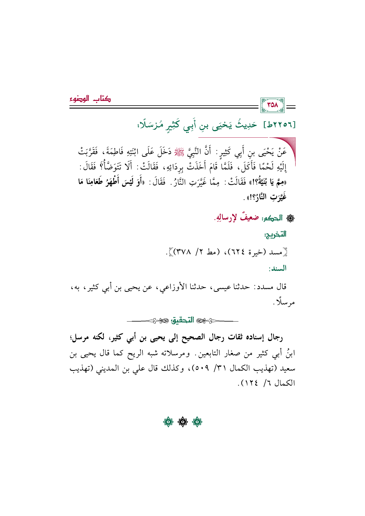 رجال إسناده ثقات رجال الصحيح إلى يحيى بن أبي كثير، لكنه مرسل؛ ابنُ أبي كثير من صغار التابعين. ومرسلاته شبه الريح كما قال يحيى بن سعيد (تهذيب الكمال ٣١/ ٥٠٩)، وكذلك قال علي بن المديني (تهذيب الكمال ٦/ ١٢٤).
