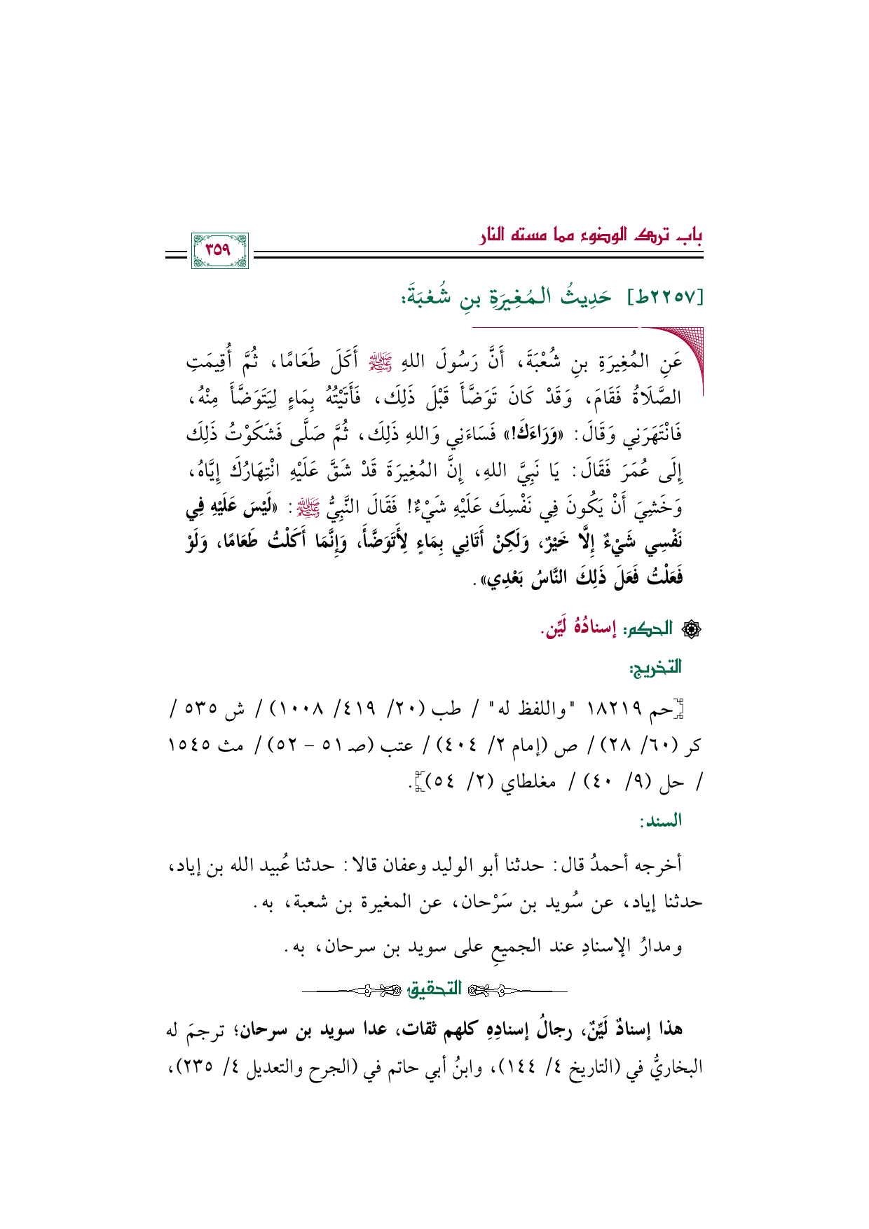 أخرجه أحمدُ قال: حدثنا أبو الوليد وعفان قالا: حدثنا عُبيد الله بن إياد، حدثنا إياد، عن سُويد بن سَرْحان، عن المغيرة بن شعبة، به.