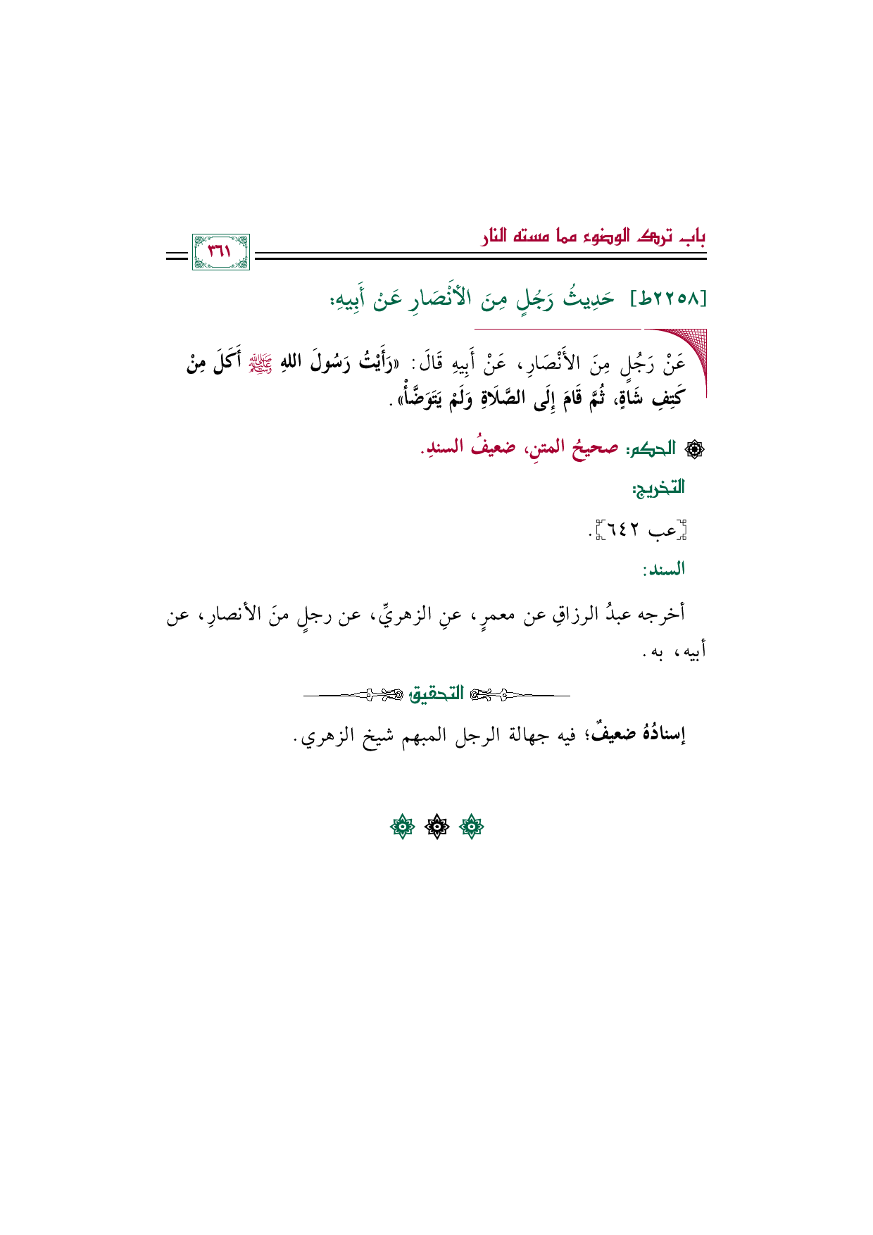 ◼ عَنْ رَجُلٍ مِنَ الأَنْصَارِ، عَنْ أَبِيهِ قَالَ: ((رَأَيْتُ رَسُولَ اللهِ صلى الله عليه وسلم أَكَلَ مِنْ كَتِفِ شَاةٍ، ثُمَّ قَامَ إِلَى الصَّلَاةِ وَلَمْ يَتَوَضَّأْ)).